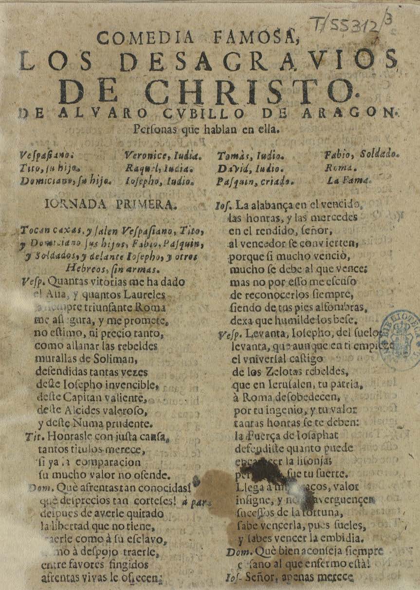 COMEDIA FAMOSA, / LOS DESAGRAVIOS / DE CHRISTO. / DE ALVARO CUBILLO DE ARAGON. / Perʃonas que hablan en ella. / [Dram. pers. a 4 col.] / IORNADA PRIMERA. / Tocan caxas, y ʃalen Veʃpaʃiano, Tito, / y Domiciano ʃus hijos, Fabio, Paʃquin, / y Soldados, y delante Ioʃepho, y otros / Hebreos, ʃin armas.