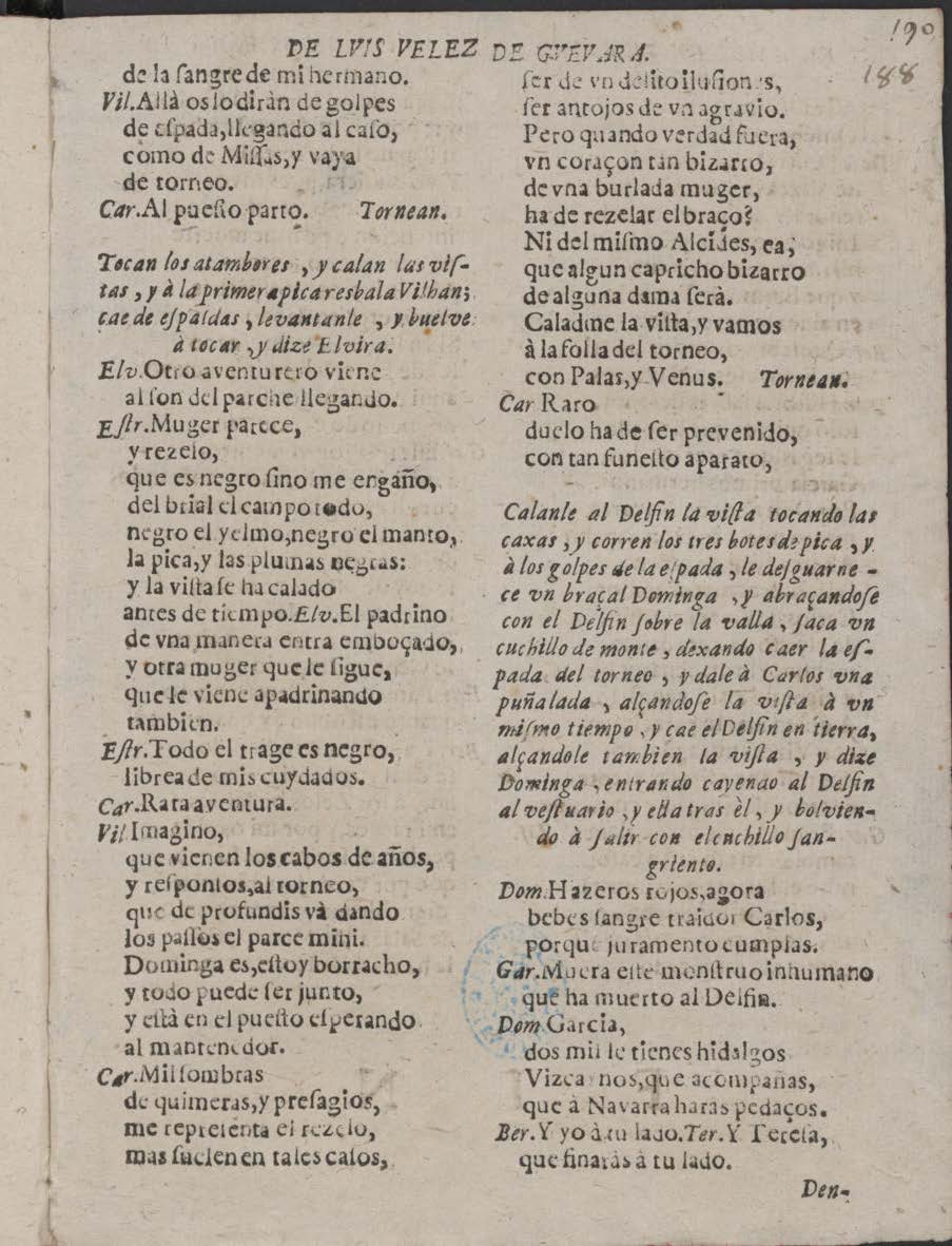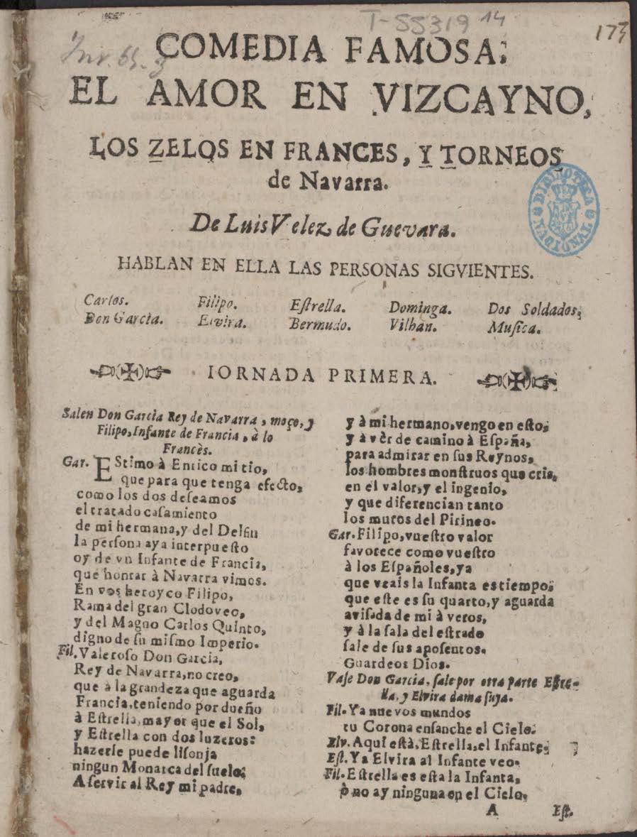 COMEDIA FAMOSA: / EL AMOR EN VIZCAYNO, / LOS ZELOS EN FRANCES, Y TORNEOS / de Navarra / De Luis Velez de Guevara / HABLAN EN ELLA LAS PERSONAS SIGVIENTES. / [dram. pers. a 5 col.] / IORNADA PRIMERA. [ornamentación a los lados]/ Salen don García Rey de Navarra, moço, y / Filipo, Infante de Francia, à lo / Francés. / Gar. Estimo à Enrico mi tio,