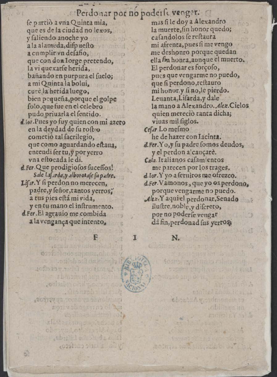 [final:] por no poderʃe vengar / dà fin,perdonad ʃus yerros. / [centrado:] FIN.