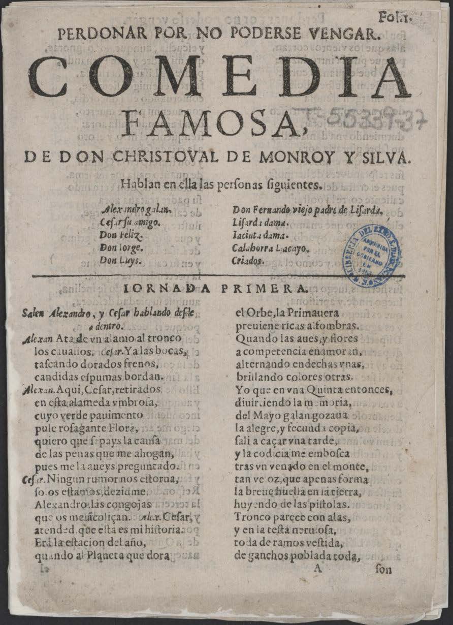 Fol. I / PERDONAR POR NO SABERSE VENGAR. / COMEDIA / FAMOSA, / DE DON CHRISTOVAL DE MONROY Y SILVA. / Hablan en ella las perſonas ſiguientes. / [dram. pers. a dos cols.] / [filete] / IORNADA PRIMERA. / [col. izq.:] Salen Alexandro, y Ceʃar hablando deʃde / a dentro. / Alexan. Ata de vn alamo al tronco / los cauallos. Ceʃar. Ya las bocas