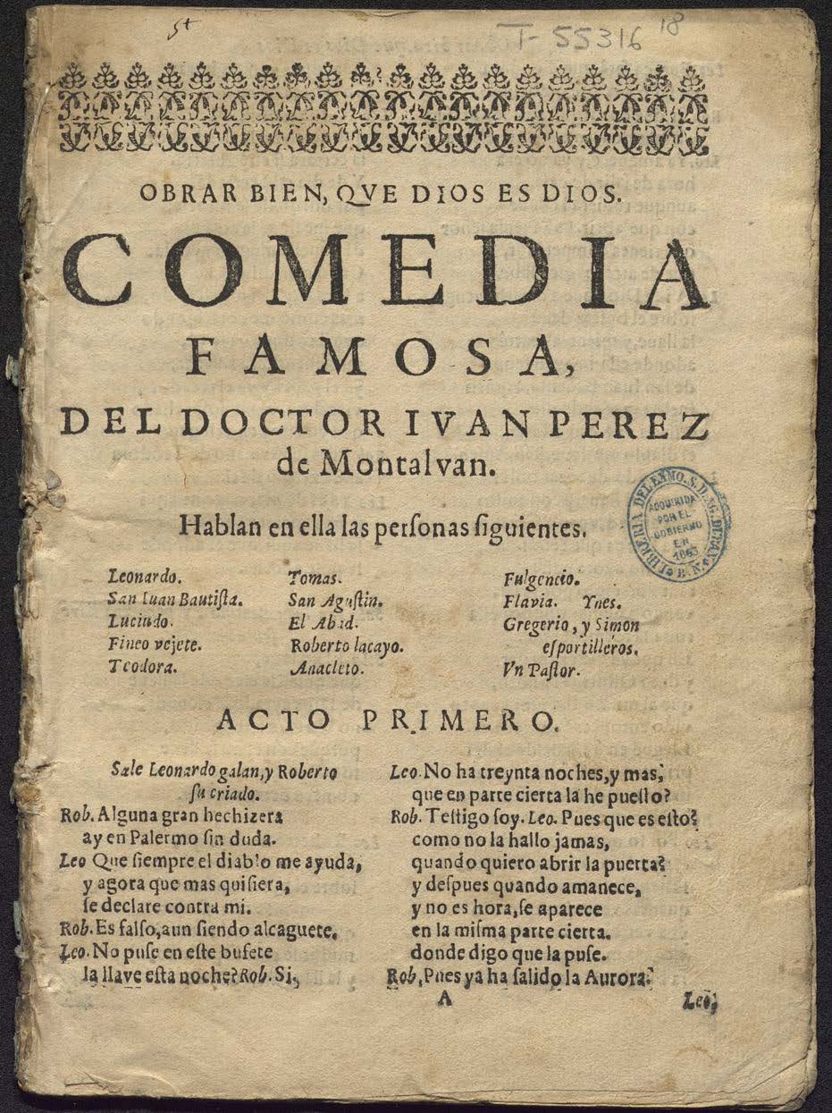[Banda formada por adornos tipográficos.] / OBRAR BIEN, QVE DIOS ES DIOS / COMEDIA / FAMOSA, / DEL DOCTOR IVAN PEREZ / de Montalvan. / Hablan en ella las perʃonas ʃiguientes. / [dram. pers. a 3 col.] / ACTO PRIMERO. / Sale Leonardo galan, y Roberto / ʃu criado. / Rob. Alguna gran hechizera / ay en Palermo ʃin duda.