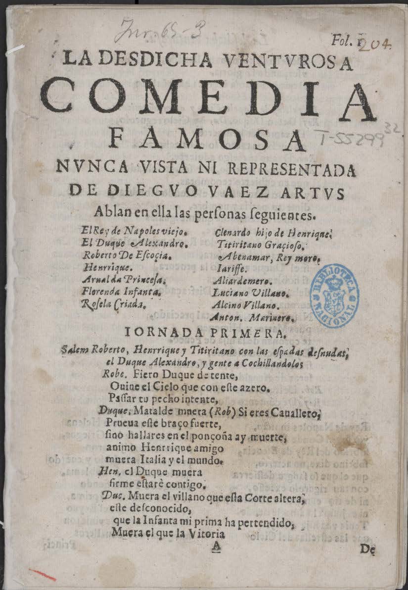Fol. I. / LA DESDICHA VENTVUROSA. / COMEDIA / FAMOSA. / NVNCA VISTA NI REPRESENTADA / DE DIEGVO VAEZ ARTVS / Ablan en ella las perſonas ſeguientes. / [dram. per. 2 col.] / IORNADA PRIMERA. / Salem Roberto, Henrrique y Titiritano con las eſpadas deſnudas, / el Duque Alexandre, y gente a Cochillandolos / Robe. Fiero Duque detente, / Ouiue el Cielo que con eſte azero.