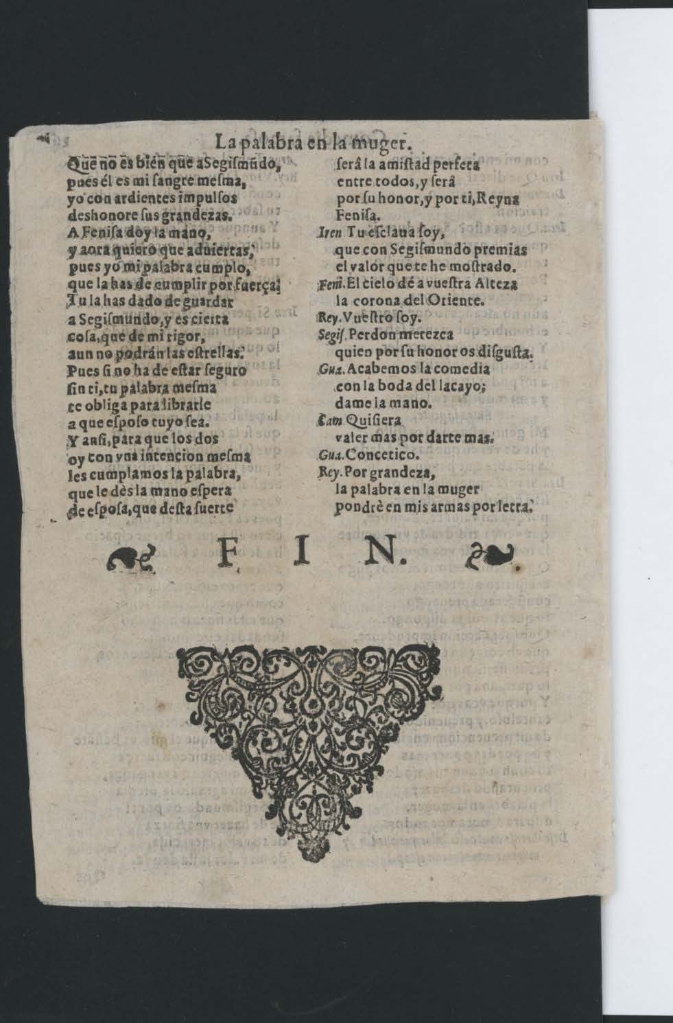 [final:] ajuſtò deſta Comedia, / dà palabras en otras muchas, / ſerviros, ſi en eſto acierta. / [cortada la parte inferior] FIN