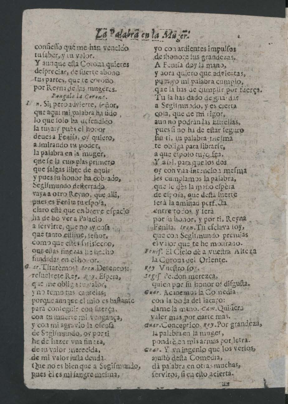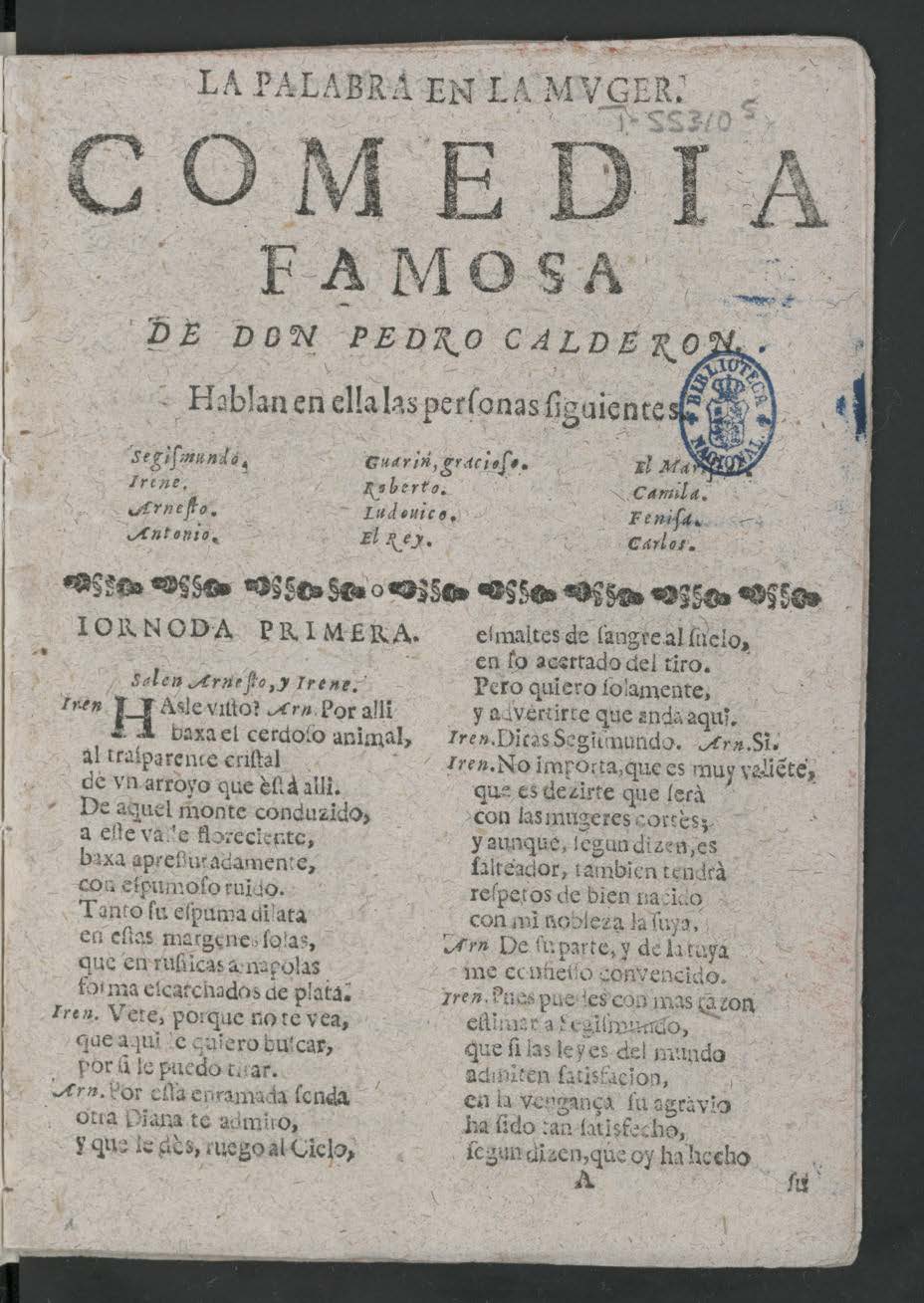 LA PALABRA EN LA MVGER. / COMEDIA / FAMOSA / DE DON PEDRO CALDERON. / Hablan en ella las perſonas ſiguientes. / [dram. pers. a 3 columnas] / [banda] / [col. izq.:] IORNODA [sic] PRIMERA. / Salen Arneſto, y Irene. / Iren. HAsle viſto? Arn. Por alli / baxa el cerdoſo animal,