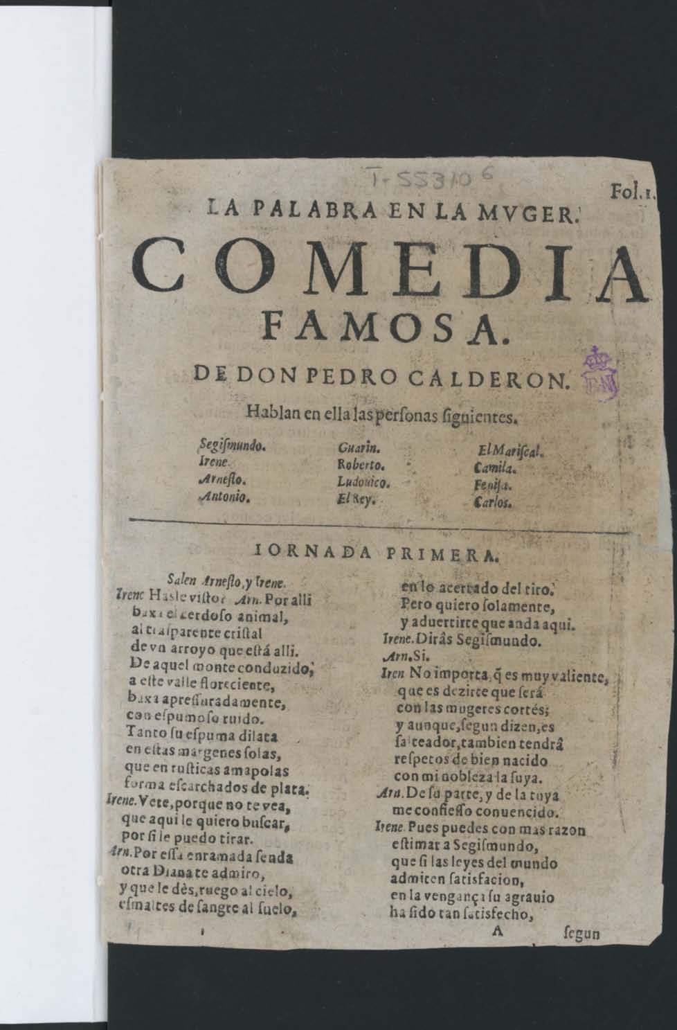 Fol. I / LA PALABRA EN LA MVGER. / COMEDIA / FAMOSA. / DE DON PEDRO CALDERON. / Hablan en ella las perſonas ſiguientes. / [dram. pers. a 3 col.] / [filete] / IORNADA PRIMERA. / Salen Arneſto, y Irene. / Irene Hasle viſto? Arn. Por alli / baxa el cerdoſo animal,