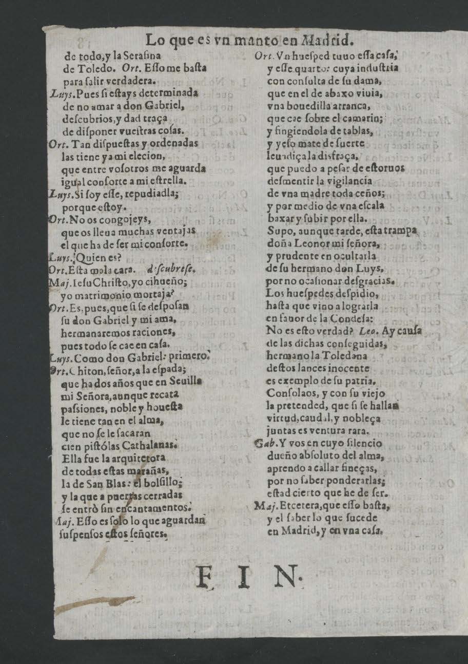 LO QVE HAZE VN MANTO EN MADRID. / COMEDIA FAMOSA. / DE DON PEDRO CALDERON. / Hablan en ella las perſonas ſiguientes. / [dram. pers. a 4 cols.] / IORNADA PRIMERA. / [col. izq.:] Salen de camino don Gabriel, / y Majuelo. / Gab. Yo ſé que eſte caſamiento