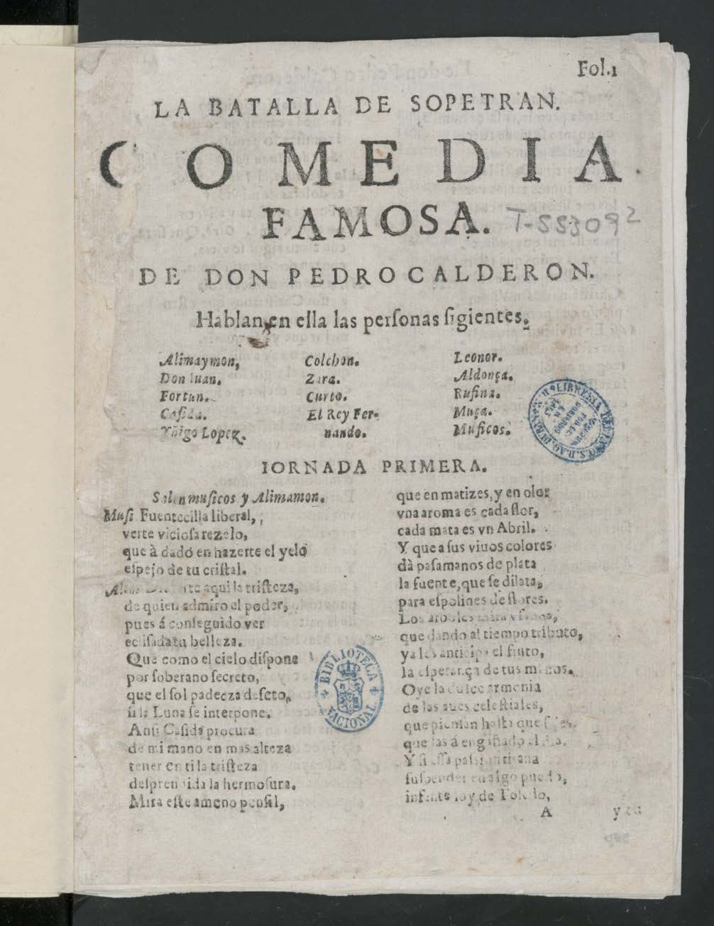 Fol. I / LA BATALLA DE SOPETRAN. / COMEDIA / FAMOSA. / DE DON PEDRO CALDERON. / Hablan en ella las perſonas ſigientes. / [dram. pers. a 3 col.] / IORNADA PRIMERA. / Salen muſicos y Alimamon. / Muſi Fuentecilla liberal, / verte vicioſa rezelo,