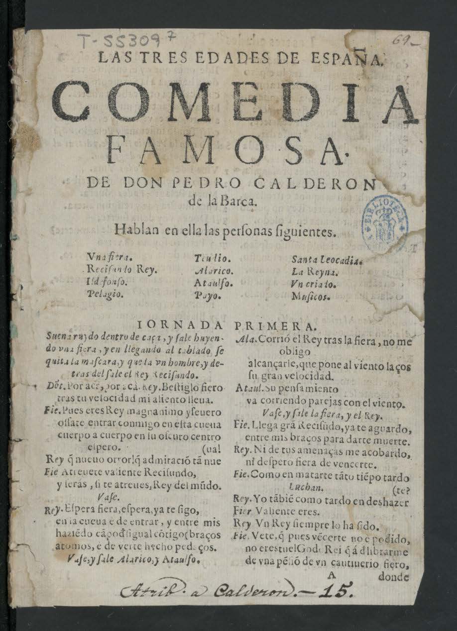LAS TRES EDADES DE ESPAÑA. [la virgulilla de la Ñ es una I colocada de forma horizontal] / COMEDIA / FAMOSA. / DE DON PEDRO CALDERON / de la Barca. / Hablan en ella las perſonas ſiguientes. / [dram. pers. en 3 col.] / IORNADA PRIMERA. / Suena ruydo dentro de caça, y ſale huyen- / do vna fiera , y en llegando al tablado ſe / quita la maſcara,y queda vn hombre,y de- / tras del ſale el Rey Reciſundo. / Dŏt. Por aca,por acà. Rey. Beſtiglo fiero / tras tu velocidad mi aliento lleua.