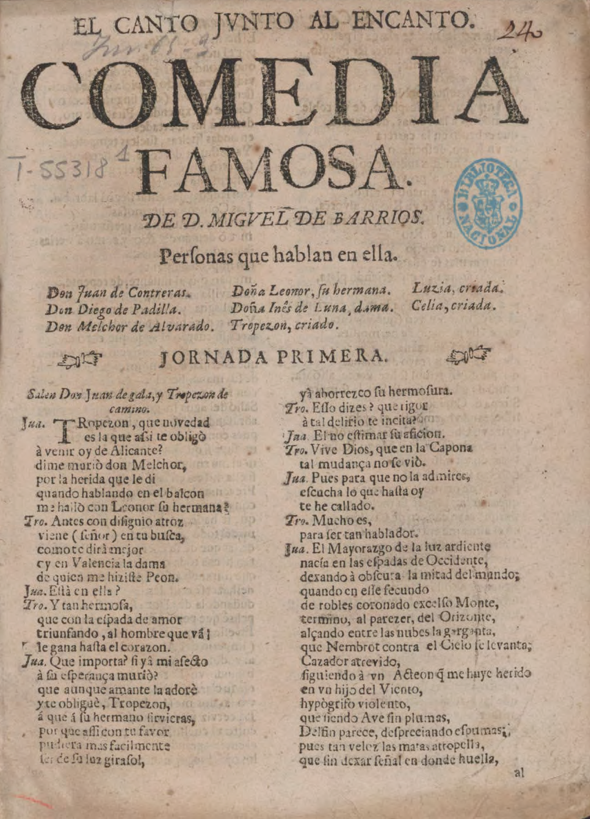 EL CANTO JVNTO AL ENCANTO. / COMEDIA / FAMOSA. / DE DON MIGVEL DE BARRIOS. / Perʃonas que hablan de ella. / [dram. pers. a 3 col.] / JORNADA PRIMERA. / Salen Don Juan de gala, y Tropezon de / camino. / Jua. TRopezon, que novedad / es la que aʃsi te obligò / à venir oy a Alicante?