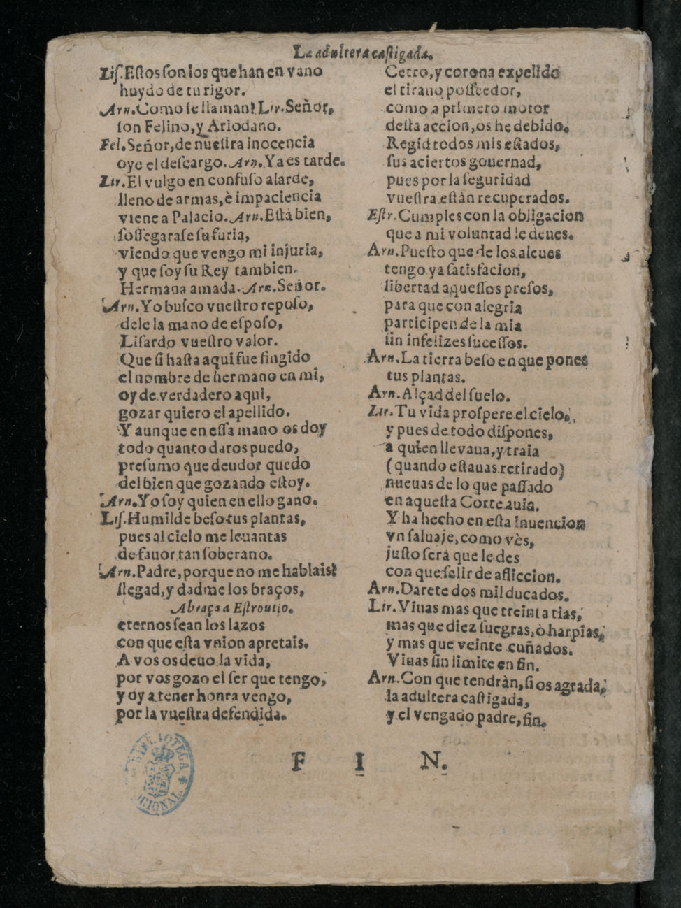 [final:] Arn. Con que tendrán, ʃi os agrada la adultera caʃtigada, y el vengado padre, fin. / FIN.