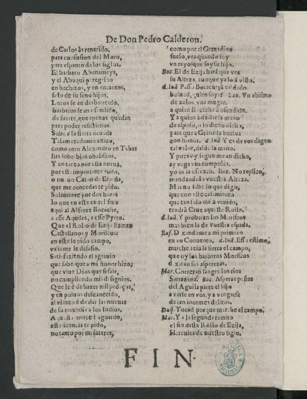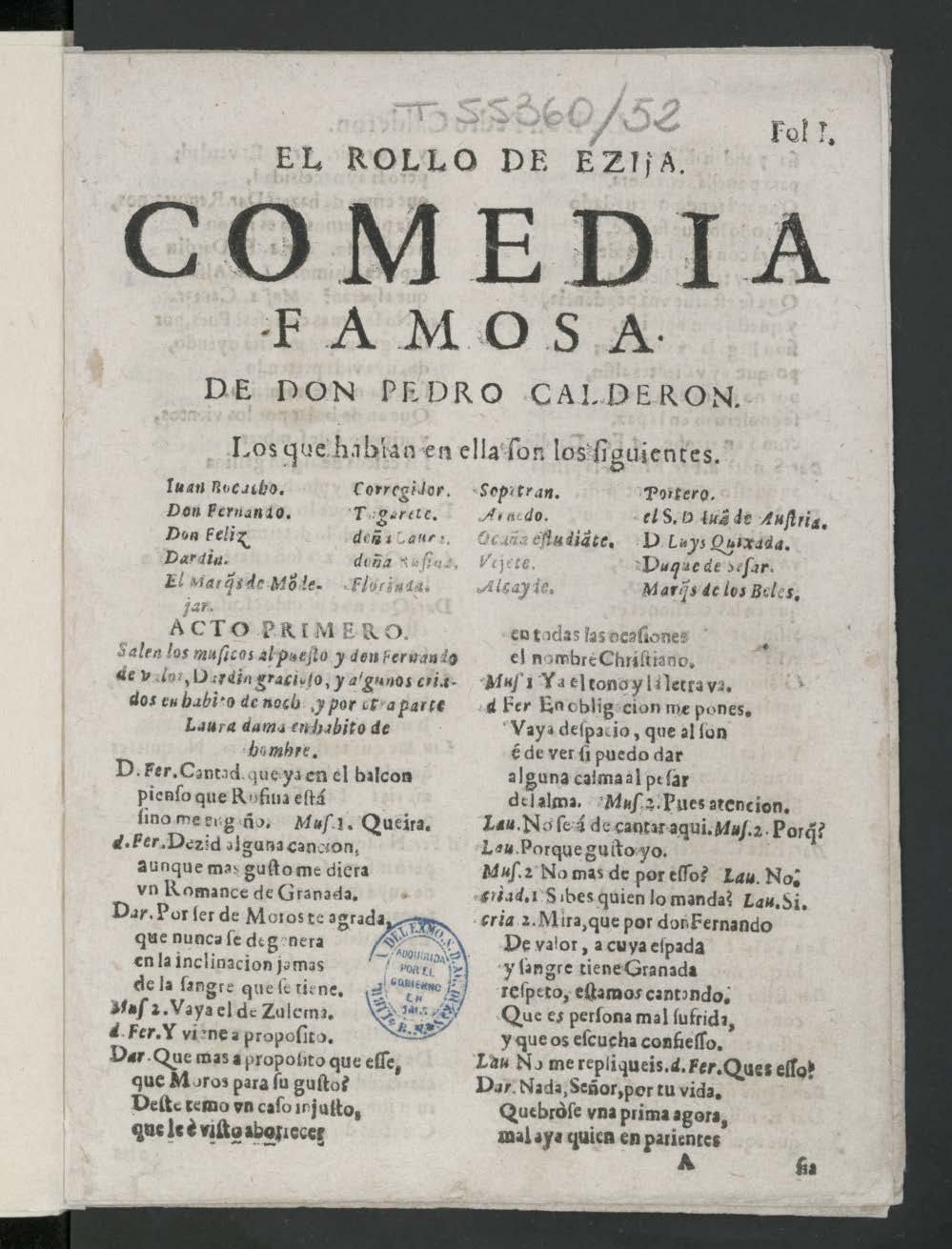 EL ROLLO DE EZIjA. / COMEDIA / FAMOSA. / DE DON PEDRO CALDERON. / Los que hablan en ella ſon los ſiguientes. / [dram. pers. a 4 col.] / ACTO PRIMERO. / Salen los muſicos al pueſto y don Fernando / de valor, Dardin gracioſo, y algunos cria- / dos en habito de noch[e], y por otra parte / Laura dama en habito de / hombre. / D. Fer.Cantad que ya en el balcon / pienſo que Rufina eſtá