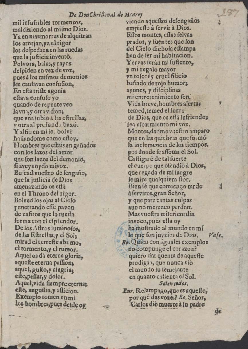4º, A-D4, 1-32 pp. sin num. Tit par: Eʃcarmientos de el Pecado, y fuerça del deʃengaño Tit. impar: De Don Christoual de Monroy. Recl. A4v diré, B4v ʃe C4v quan-