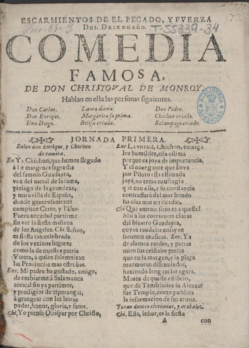 ESCARMIENTOS DE EL PECADO, Y FVERZA / DEL DESENGAñO. / COMEDIA / FAMOSA, / DE DON CHRISTOVAL DE MONROY. / Hablan en ella las perʃonas ʃiguientes. / [dram. pers a 3 col.] / filete y manecillas dobles JORNADA PRIMERA. / Salen don Enrique, y Chichon / de camino. / En. Ya Chichon que hemos llegado / á las margenes ʃagradas
