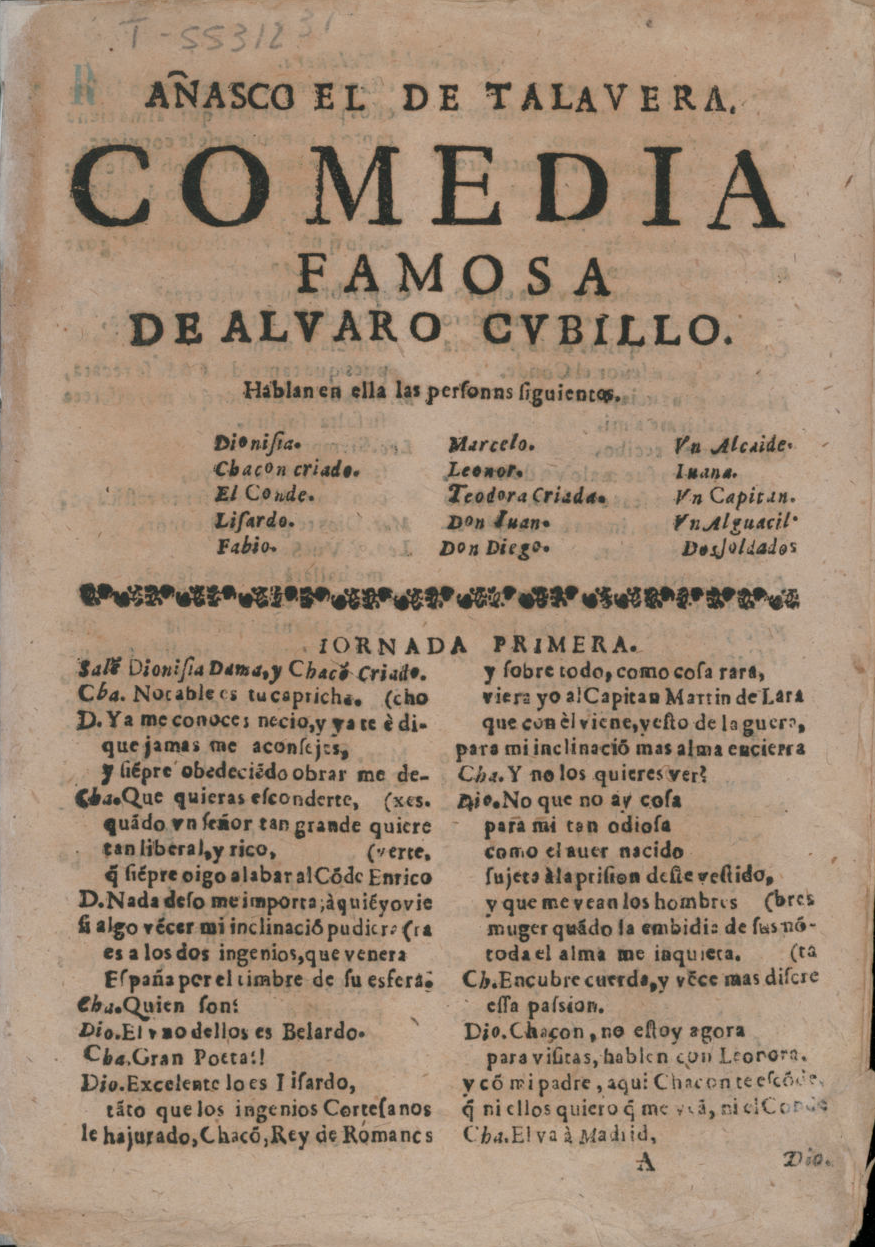 AÑASCO EL DE TALAVERA. / COMEDIA / FAMOSA. / DE ALVARO CVBILLO. / PERSONAS. / [dram. pers. a 3 col.]/IORNADA PRIMERA. / Sale Dioniʃia Dama, y Cbaco Criado. /