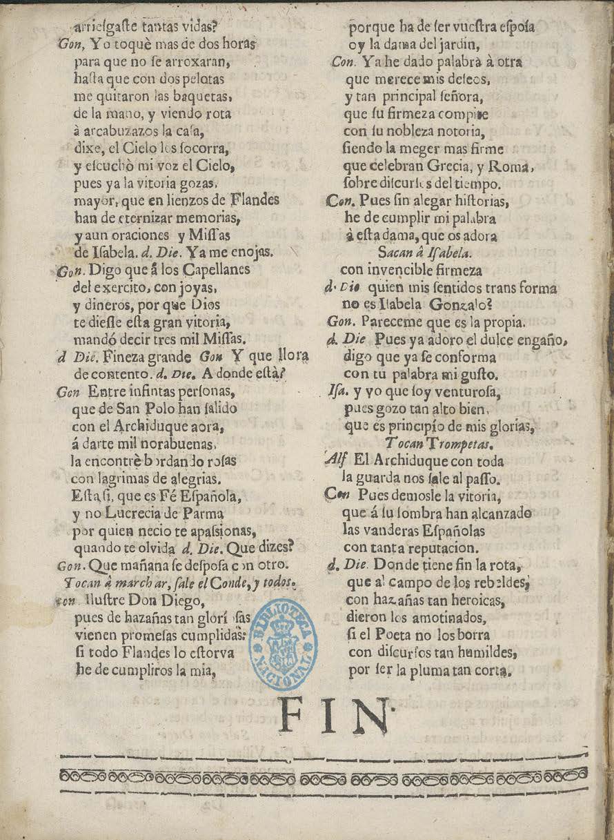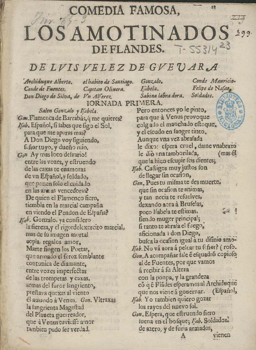 COMEDIA FAMOSA, / LOS AMOTINADOS / DE FLANDES. / DE LVIS VELEZ DE GVEUARA / [dram. pers. a 4 col.] / IORNADA PRIMERA. / Salen Gonzalo y Iʃabela. / Gon. Flamenca de Barrabàs, q’ me quieres? [final:] con diʃcursos tan humildes, / por ʃer la pluma tan corta. / FIN.