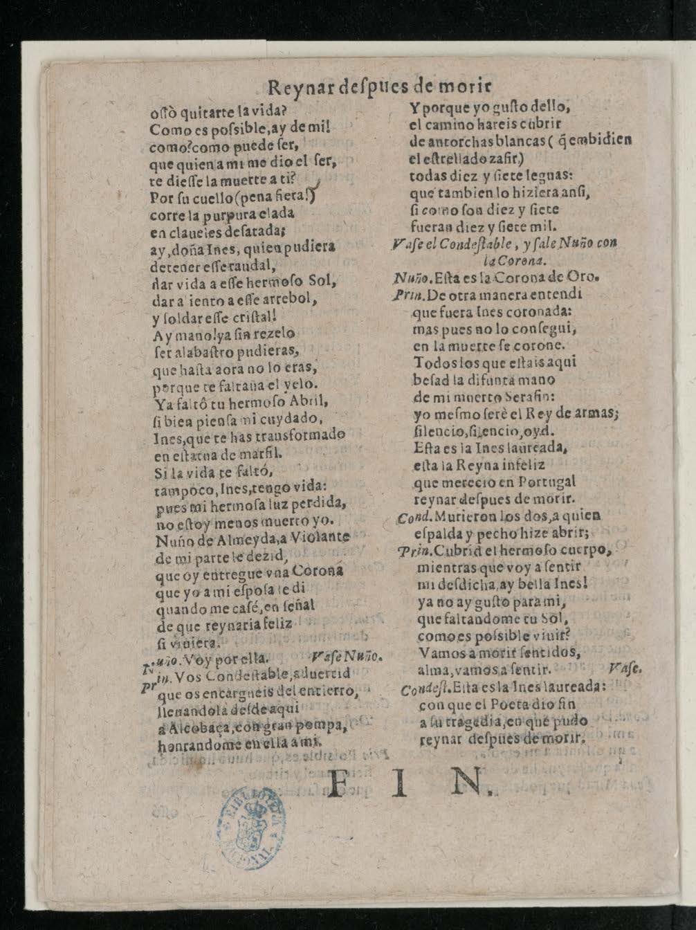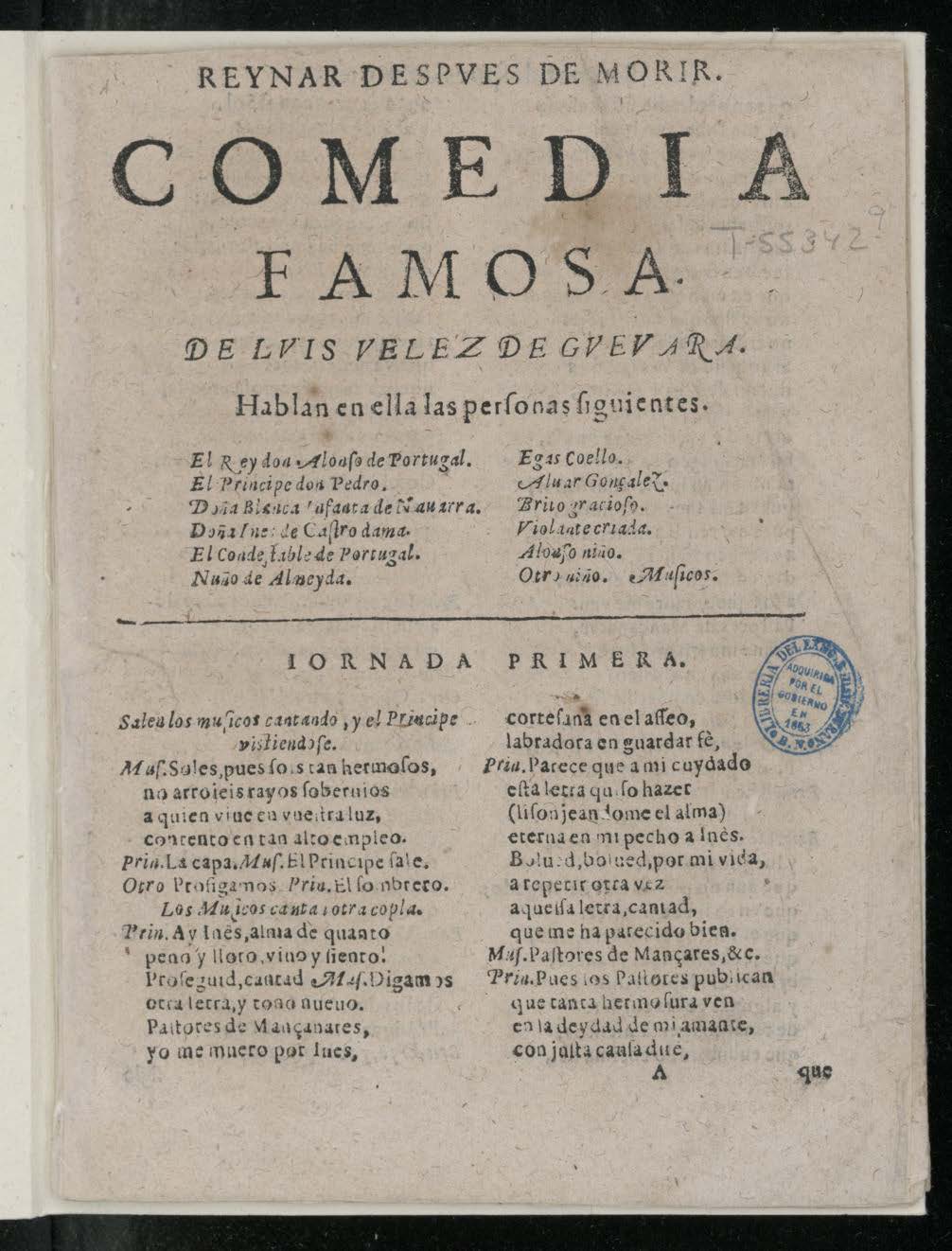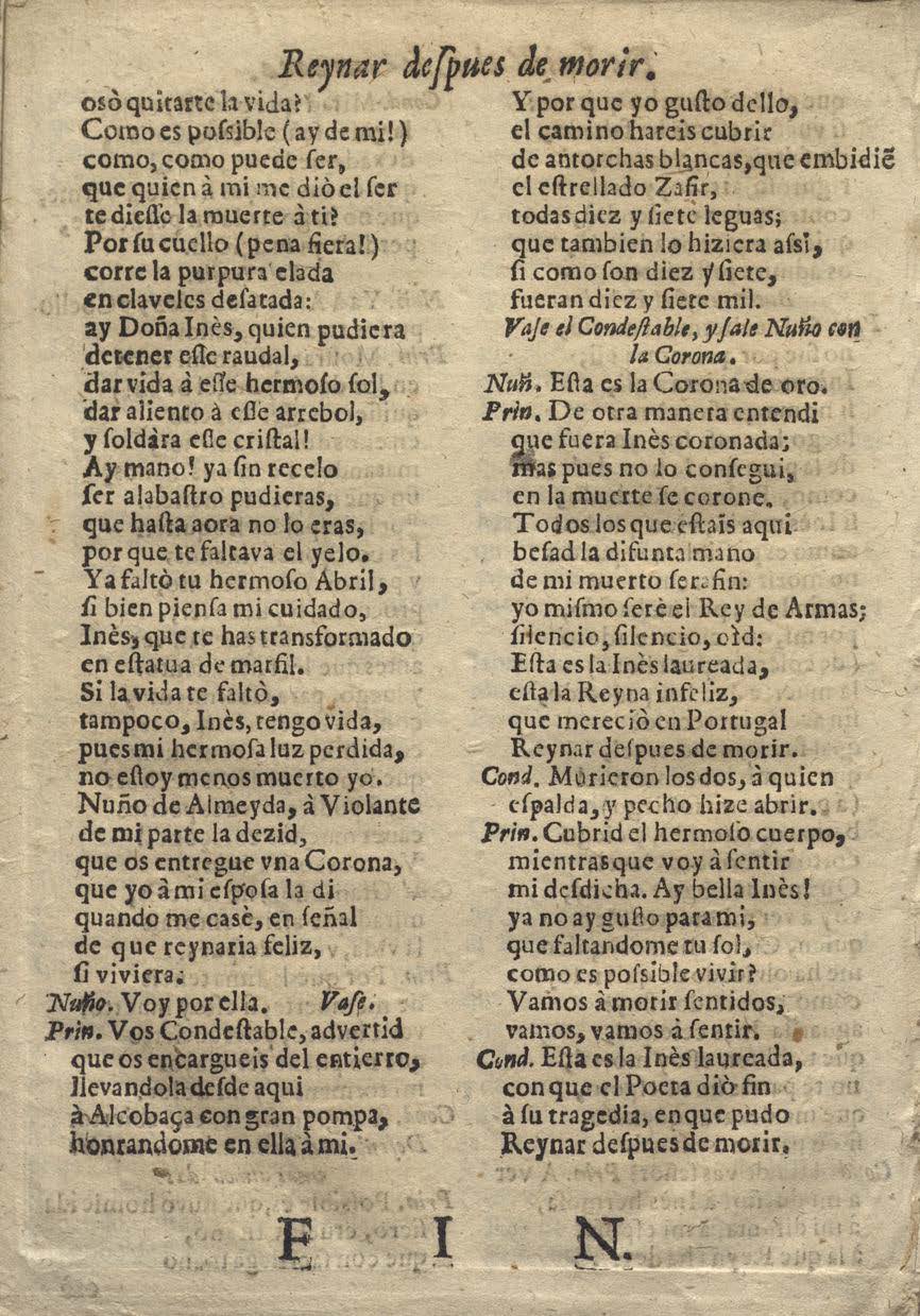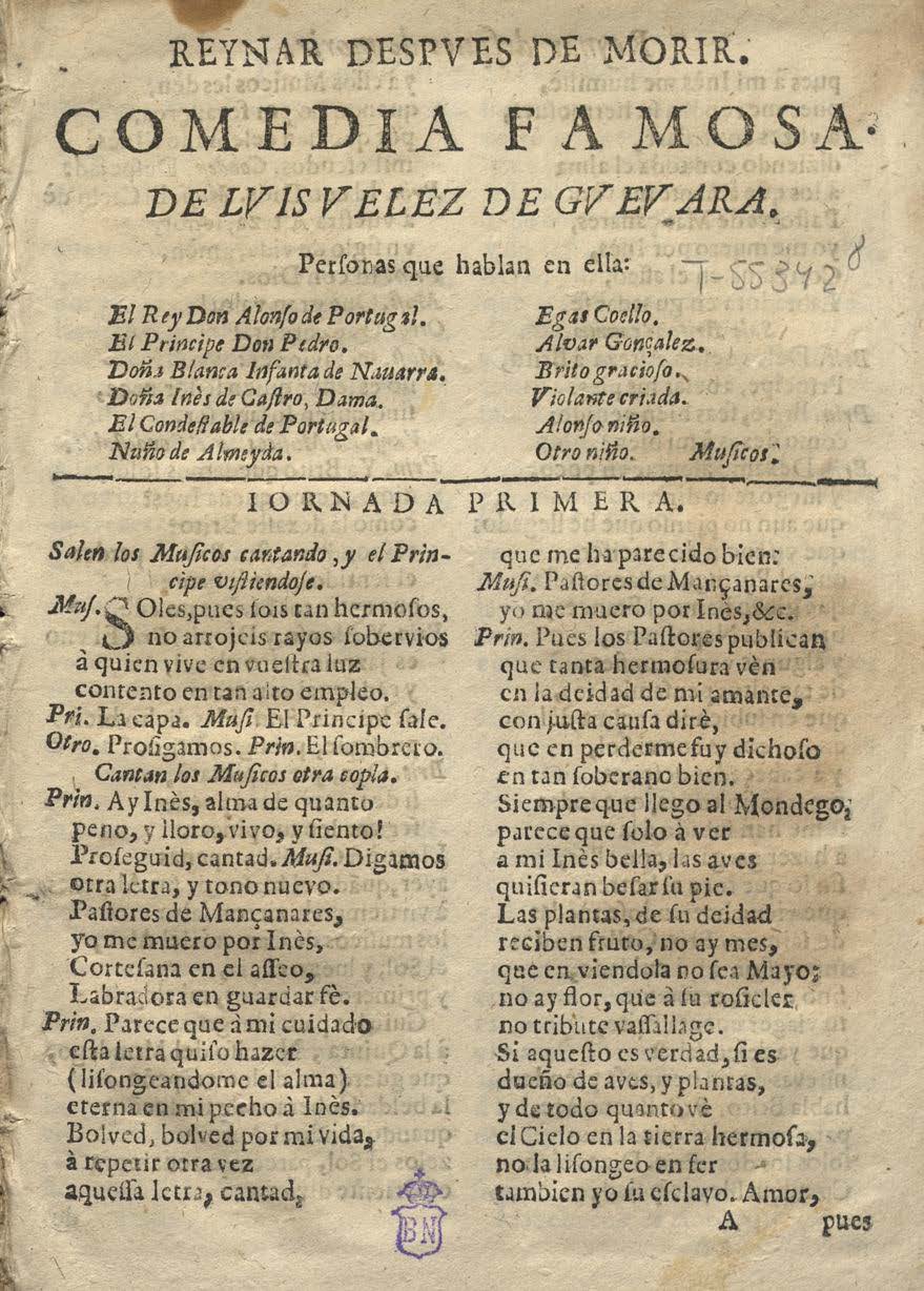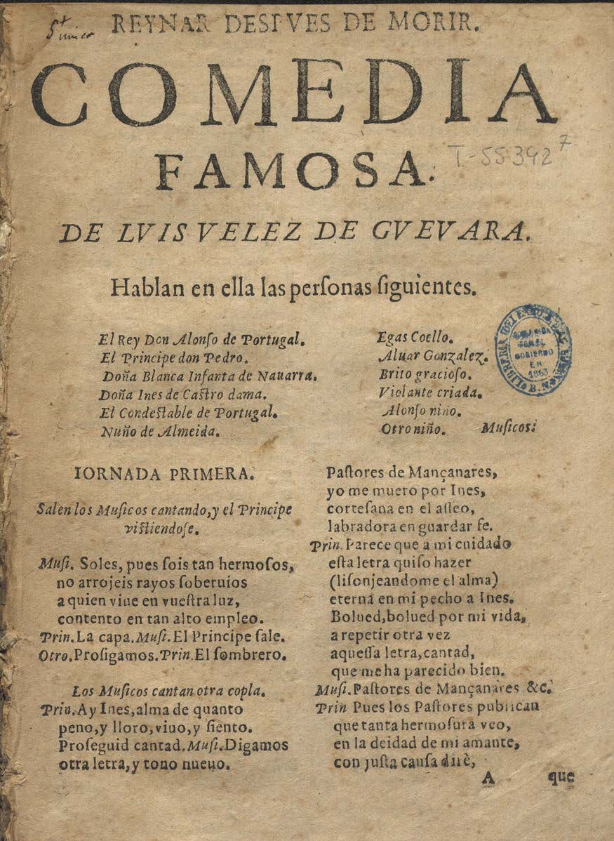 REYNAR DESPVES DE MORIR. / COMEDIA / FAMOSA / DE LVIS VELEZ DE GVEVARA. / Hablan en ella las perʃonas ʃiguientes. / [dram. Pers. a 2 col.] / IORNADA PRIMERA. / Salen los muʃicos cantando, y el Principe vistiendoʃe. / Muʃ. Soles, pues ʃois tan hermoʃos, / no arrojeis rayos ʃoberuios / a quien viue en vueʃtra luz, / [final:] Cond. Eʃta es la Ynes laurada / conque el Poeta dio fin/ a ʃu tragedia, en que pudo / Reinar deʃpues de morir. / FIN.