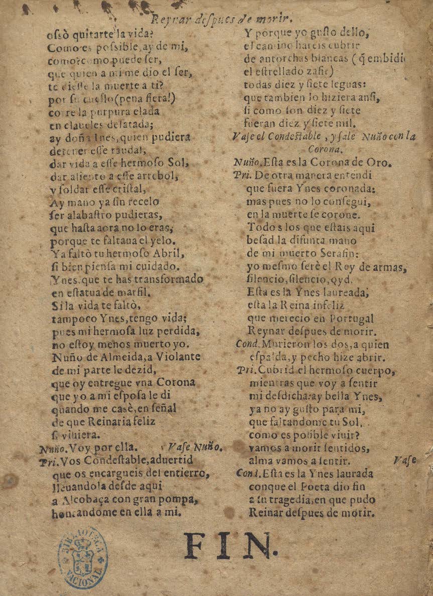 [final:] Condeʃt. Eʃta es la Ines laureada: / Con que el Poeta dio fin / a ʃu tragedia, en que pudo / reynar deʃpues de morir.