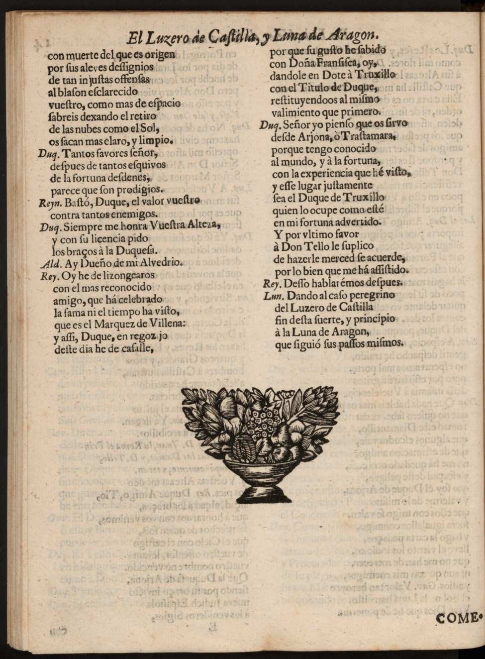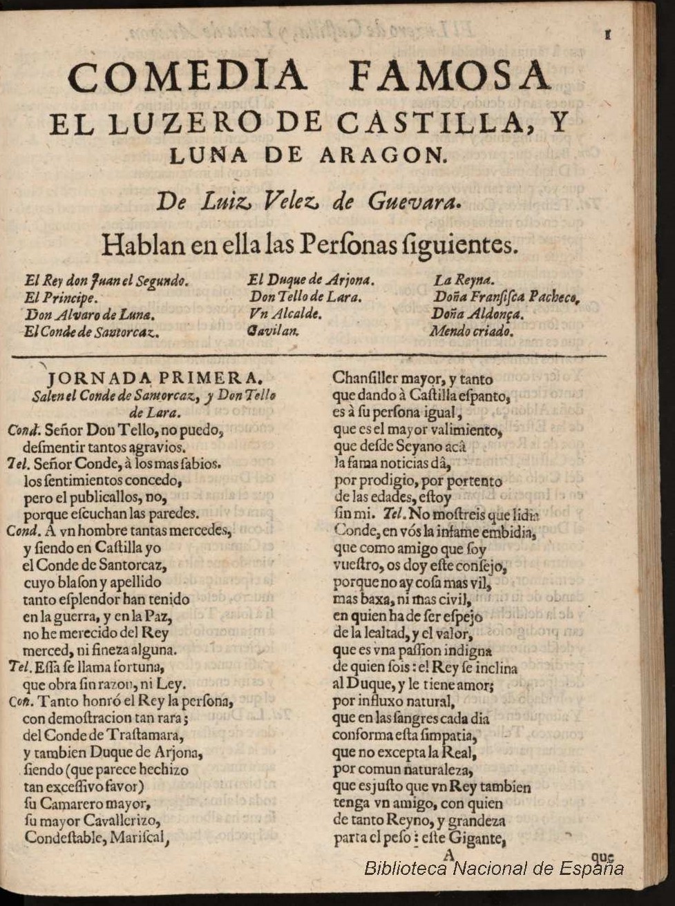 COMEDIA FAMOSA / EL LUZERO DE CASTILLA, Y / LUNA DE ARAGON. / De Luiz [sic] Velez de Guevara. / Hablan en ella las perʃonas ʃiguientes. / [dram. pers. a 3 col.] / JORNADA PRIMERA. / Salen el Conde de Santorcaz, y Don Tello / de Lara. / Cond. Señor Don Tello, no puedo, [final:] à la Luna de Aragon, / que ʃiguió ʃus paʃʃos miʃmos.