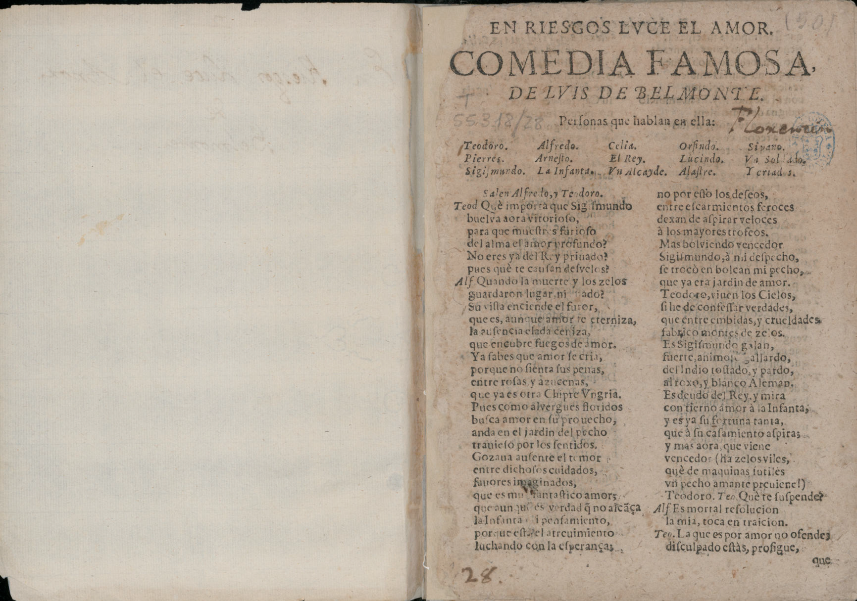 EN RIESGOS LVCE EL AMOR. / COMEDIA FAMOSA, / DE LVIS DE BELMONTE. / Perſonas que hablan en ella: / [dram. pers. a 5 col.] / Salen Alfredo, y Teodoro. / Teod Què importa que Sigiʃmundo / buelva ahora vitorioʃo,