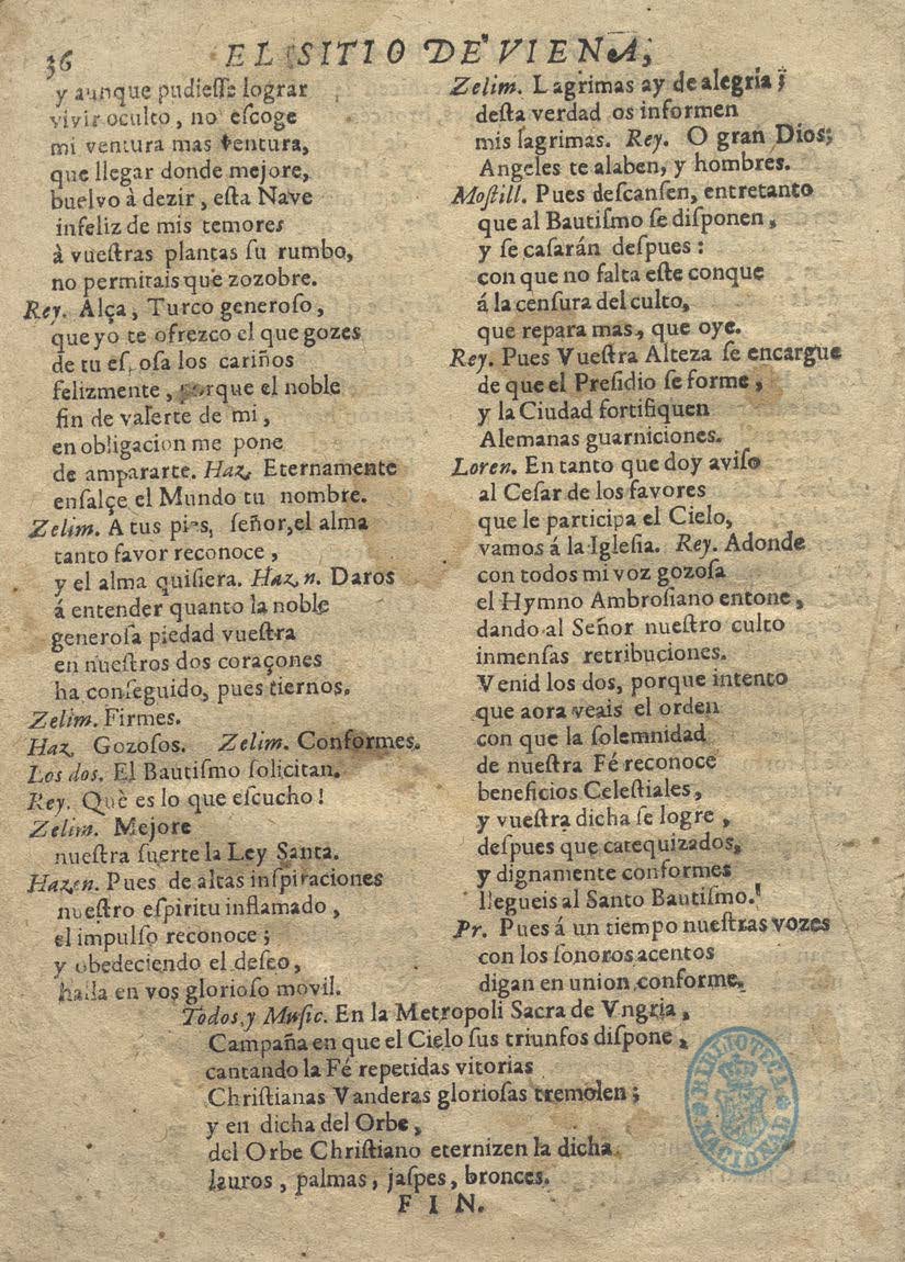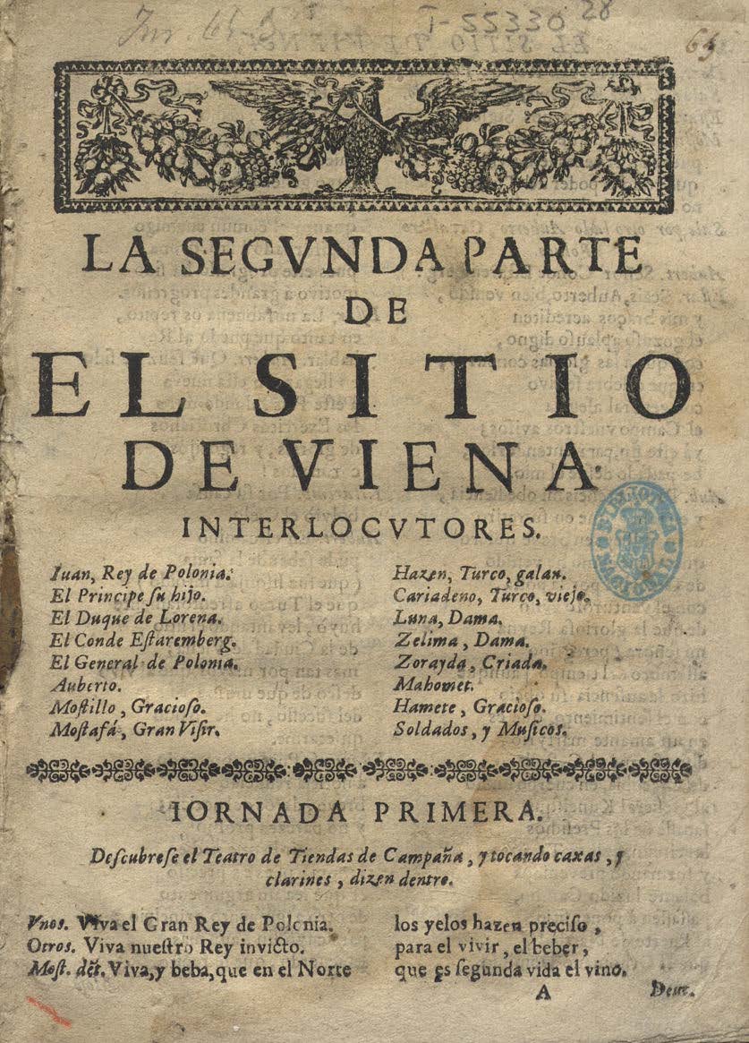 [P.1:] [Grabado xilográfico] / LA SEGVNDA PARTE / DE / EL SITIO / DE VIENA. / INTERLOCVTORES. / [dram. pers.a dos col.] / [Adorno xilográfico.] / IORNADA PRIMERA. / Deʃcubreʃe el Teatro de Tiendas de Campaña, y tocando caxas, y / clarines, dizen dentro. / Vnos. Viva el Gran Rey de Polonia. / Otros. Viva nueʃtro Rey invicto. /