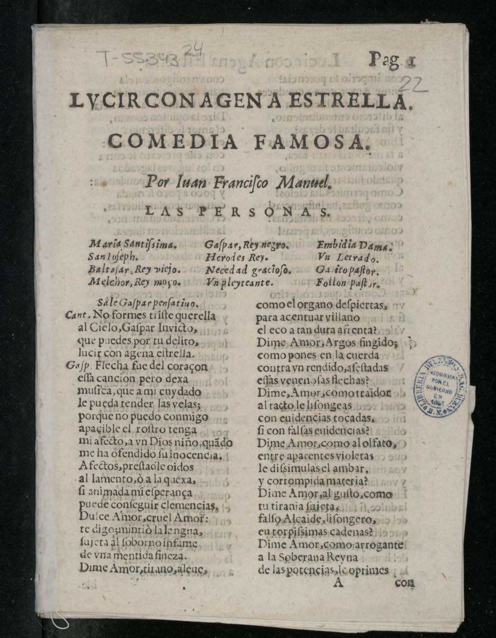 LVCIR CON AGEN A ESTRELLA. / COMEDIA FAMOSA. / Por Iuan Franciʃco Manuel. / LAS PERSONAS. / [dram. pers. a 3 col.] / [col. izq.:] Sale Gaʃpar penʃatiuo. / Cant. No formes triʃte querella / al Cielo, Gaʃpar Invicto, /