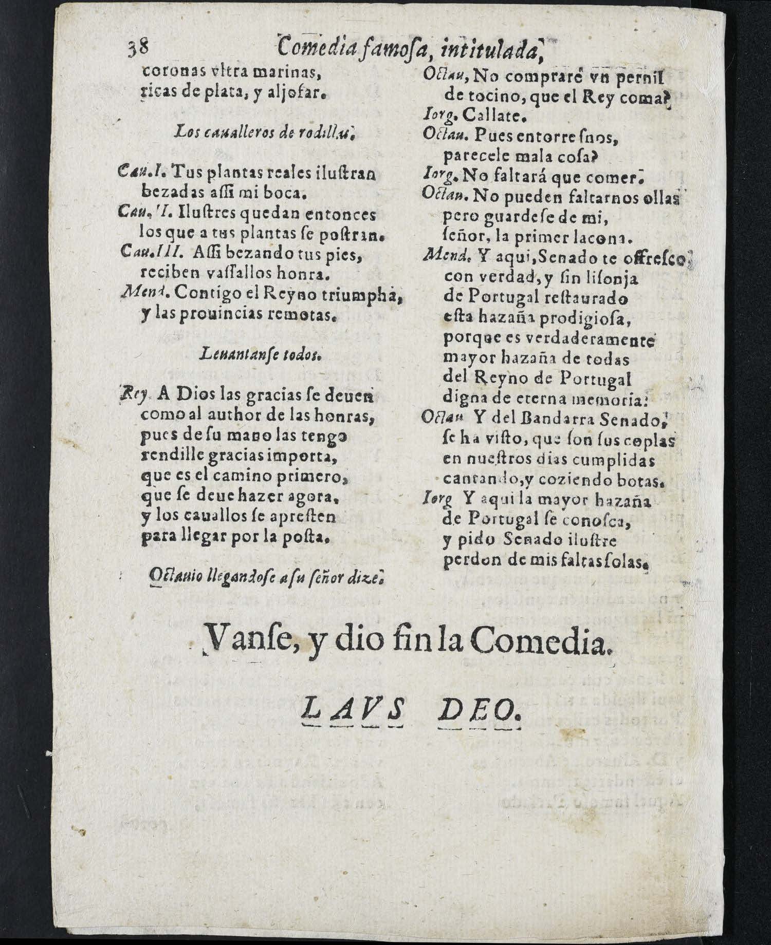 [Final:] y pido Senado iluʃtre / perdon de mis faltas ʃolas, / Vanʃe, y dio fin la Comedia. / LAVS DEO. /