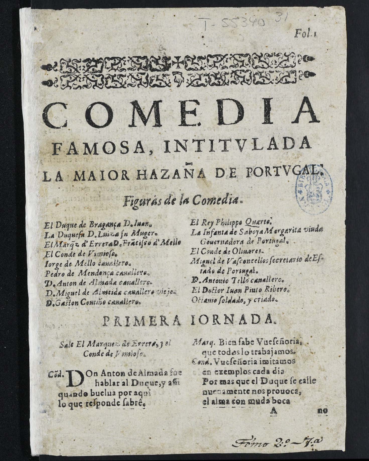 Fol. I. / [Banda tipográfica formada por adornos xilográficos.] / COMEDIA / FAMOSA, INTITVLADA / LA MAIOR HAZAÑA DE PORTVGAL. / Figuras de la Comedia. / [dram. pers. a 2 col.] / PRIMERA IORNADA. / [col. izq.:] Sale El Marquez de Errera, y el / Conde de Vimioʃo. / Cid. Don Anton de Almada fue / hablar al Duque, y aʃʃi / [...] /