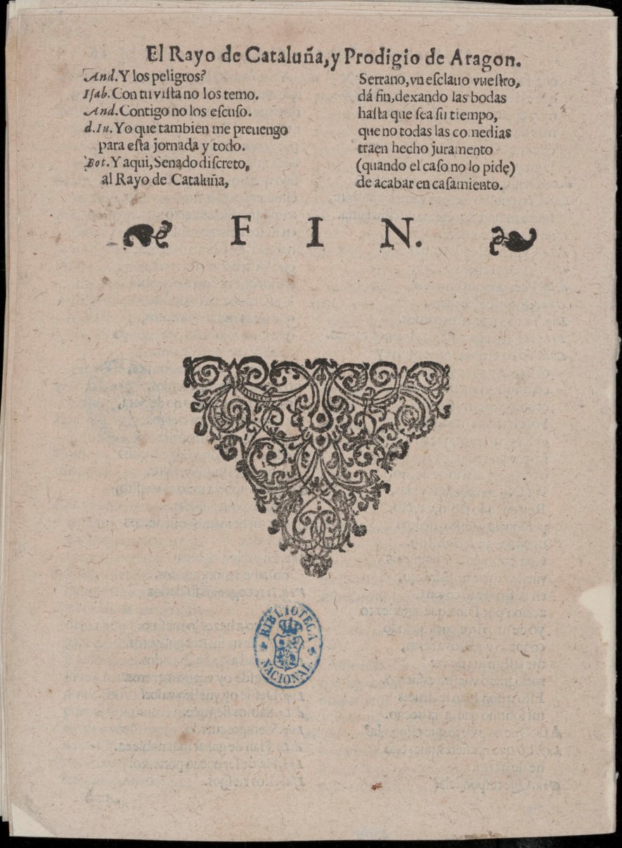 4º, A-D⁴, 1-16 ff. Tit El Rayo de Cataluña,y Prodigio de Aragon. [¿El Rayo de Cataluña,y Prodigio de Aragen. A2v?] // De Franciſco Serrano Carimo. [De Franciſco Serrano Carimo A2r A4r B2r D1r] Recl. A4v del B4v Salen C4v con