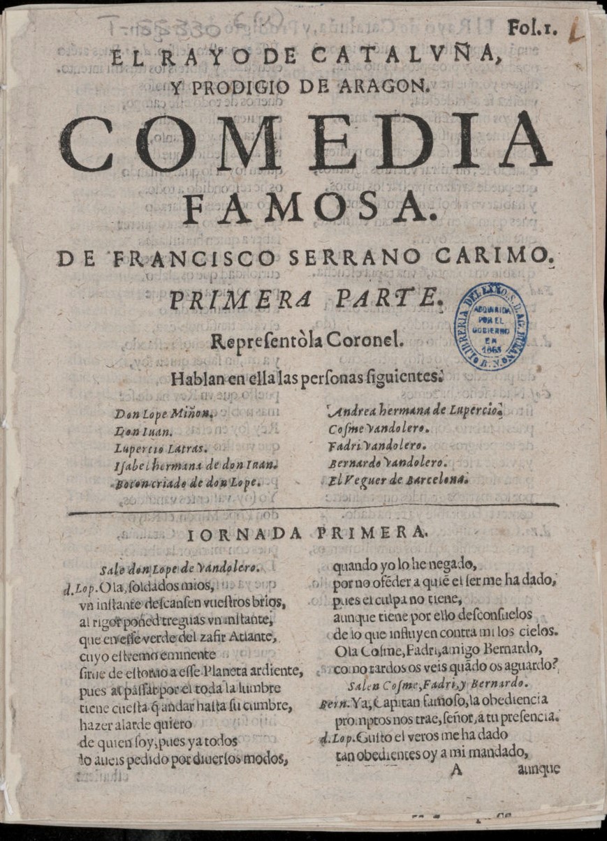 Fol. I. / EL RAYO DE CATALVÑA, / Y PRODIGIO DE ARAGON. / COMEDIA / FAMOSA. / DE FRANCISCO SERRANO CARIMO. / PRIMERA PARTE. / Repreſentòla Coronel. / Hablan en ella las perſonas ſiguientes. / [dram. per. 2 col.] / [línea] / IORNADA PRIMERA. / Sale don Lope de Vandolero. / d. Lop. Ola,ſoldados mios, / vn inſtante deſcanſen vueſtros brios,