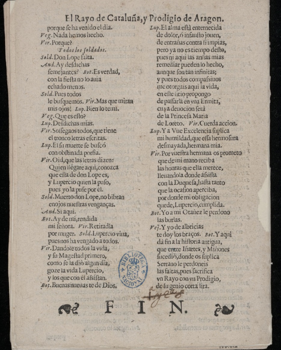 Fol. I. / EL RAYO DE CATALVÑA, / Y PRODIGIO DE ARAGON. / COMEDIA / FAMOSA. / DE FRANCISCO SERRANO CARIMO. / SEGVNDA PARTE. / Repreſentòla Coronel. / Hablan en ella las perſonas ſiguientes. / [dram. per. 2 col.] / [línea] / IORNADA PRIMERA. / Salen el Virrey de Barcelona,el Veguer,y / acompañamiento. / Vir. Aũque ſuMageſtad,q el cielo guarde, / en ſu delito,el mas piadoſo alarde