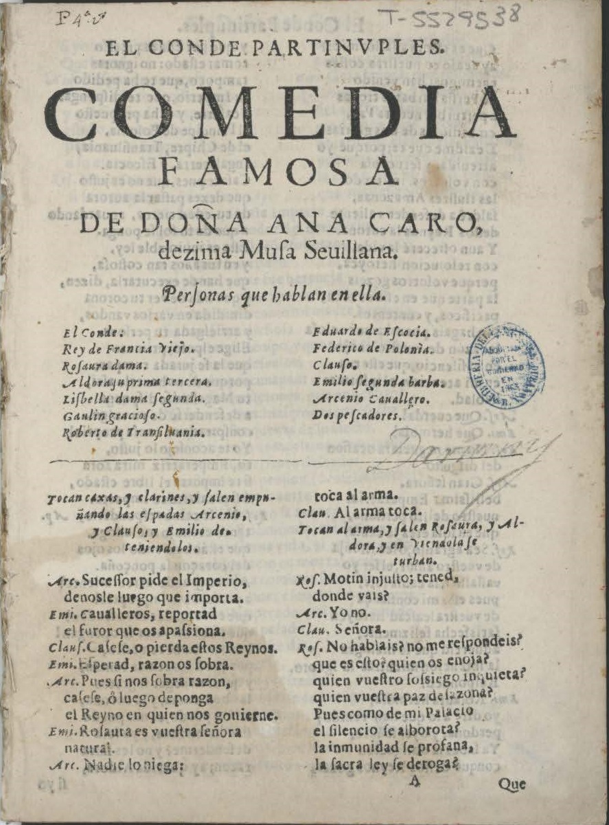 EL CONDE PARTINVPLES. / COMEDIA / FAMOSA / DE DOÑA ANA CARO, / dezima Muʃa Sevillana. / Perʃonas que hablan en ella. / [Dram. pers a 2 cols.] / Tocan caxas, y clarines, y ʃalen empu- / ñando las eʃpadas Arcenio, / y Clauʃo, y Emilio de- / teniéndolos. / Arc. Suceʃʃor pide el Imperio, / denosle luego que importa.