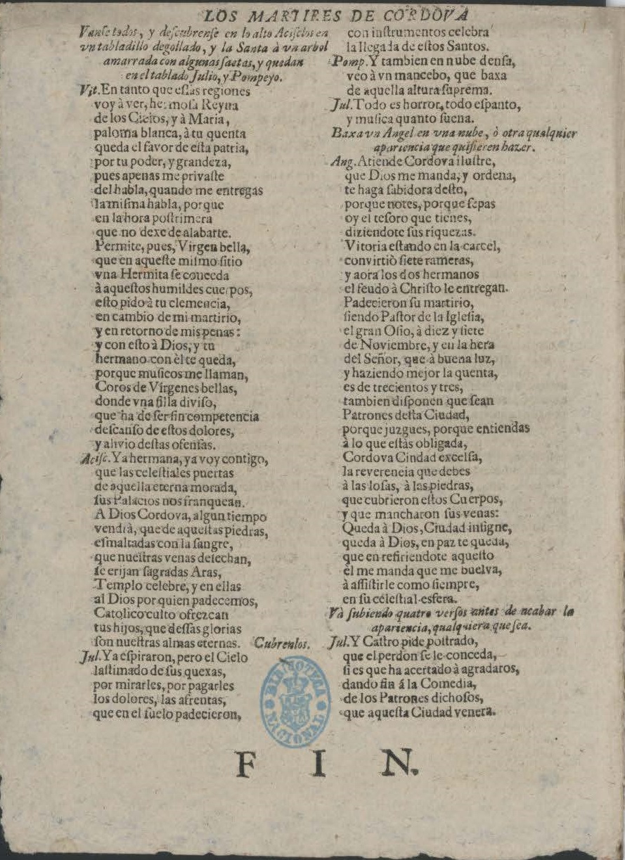 LOS MARTYRES DE CORDOVA. / COMEDIA / FAMOSA, / DE DON ANTONIO DE CASTRO. / Hablan en ella las perʃonas ʃiguientes. / [dram. pers. a dos cols.] / [filete] / JORNADA PRIMERA. / Tocan caxas, y clarines, y ʃale el / Preʃidente./ Preʃi. Mientras mi exercito grande, / a Cordova marcha invicto, / al ʃon del parche ruydoʃo,