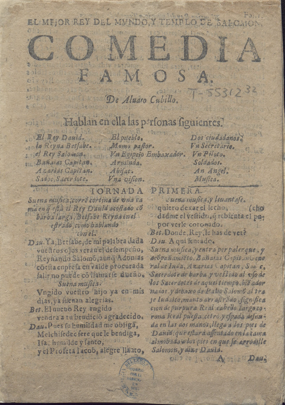 Fol. I. / EL MEJOR REY DEL MVNDO, Y TEMPLO DE SALOMON. / COMEDIA / FAMOSA. / De Aluaro Cubillo. / Hablan en ella las perʃonas ʃiguientes. / [dram. per. a 3 col.] /IORNADA PRIMERA. / Suena muʃica; corre cortina de una ca / ma en q eʃtã el Rey Dauid acoʃtado cõ /barba larga, Betʃabe Rayna en el / eʃtrado, como habando / con el.