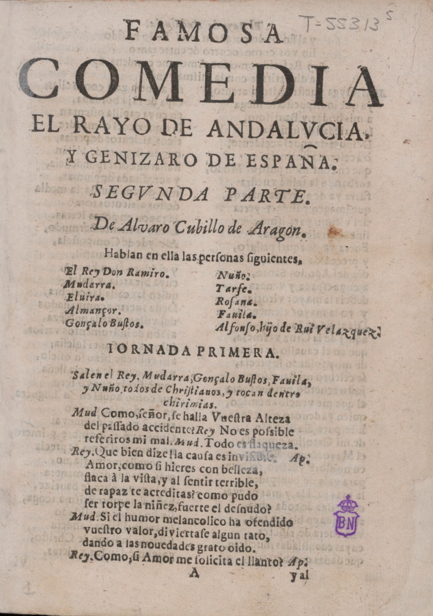 FAMOSA / COMEDIA/ EL RAYO DE ANDALVCIA, / Y GENIZARO DE ESPAÑA. / SEGUNDA PARTE. / De Alvaro Cubillo de Aragon. / Hablan en ella las perʃonas ʃiguientes. / [dram. pers. a 2 col.] / Salen el Rey, Mudarra, Gonçalo Buʃtos, Fauila / y Nuño todos de Chriʃtianos, y tocan dentro / chirimías. / Mud Como, ʃeñor, ʃe halla Vueʃtra Alteza