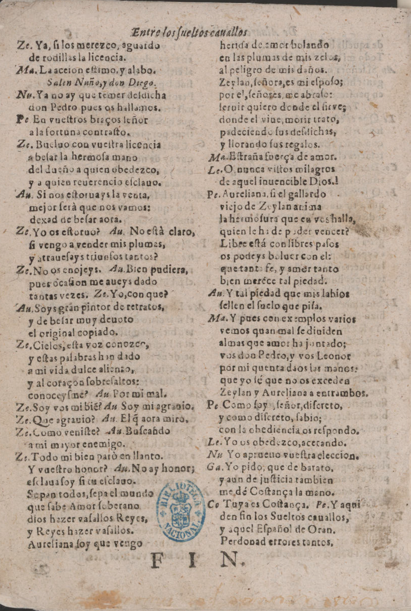[final:] Y aqui / den fin los Sueltos cauallos, / y aquel Eʃpañol de Oran. / Perdonad errores tontos. / FIN.