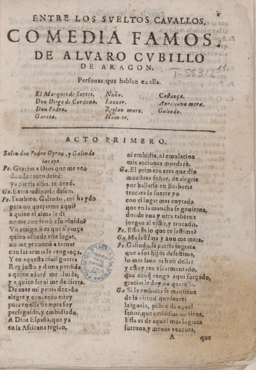 ENTRE LOS SVELTOS CAVALLOS. / COMEDIA FAMOS / DE ALVARO CVBILLO / DE ARAGON. / Perʃonas que hablan el ella. / [dram. pers. a 3 col.]/ ACTO PRIMERO. / Salen don Pedro Gyrou, y Galindo /lacayo./ Pe. Gracias a Dios que me veo / donde tanto deʃeé:
