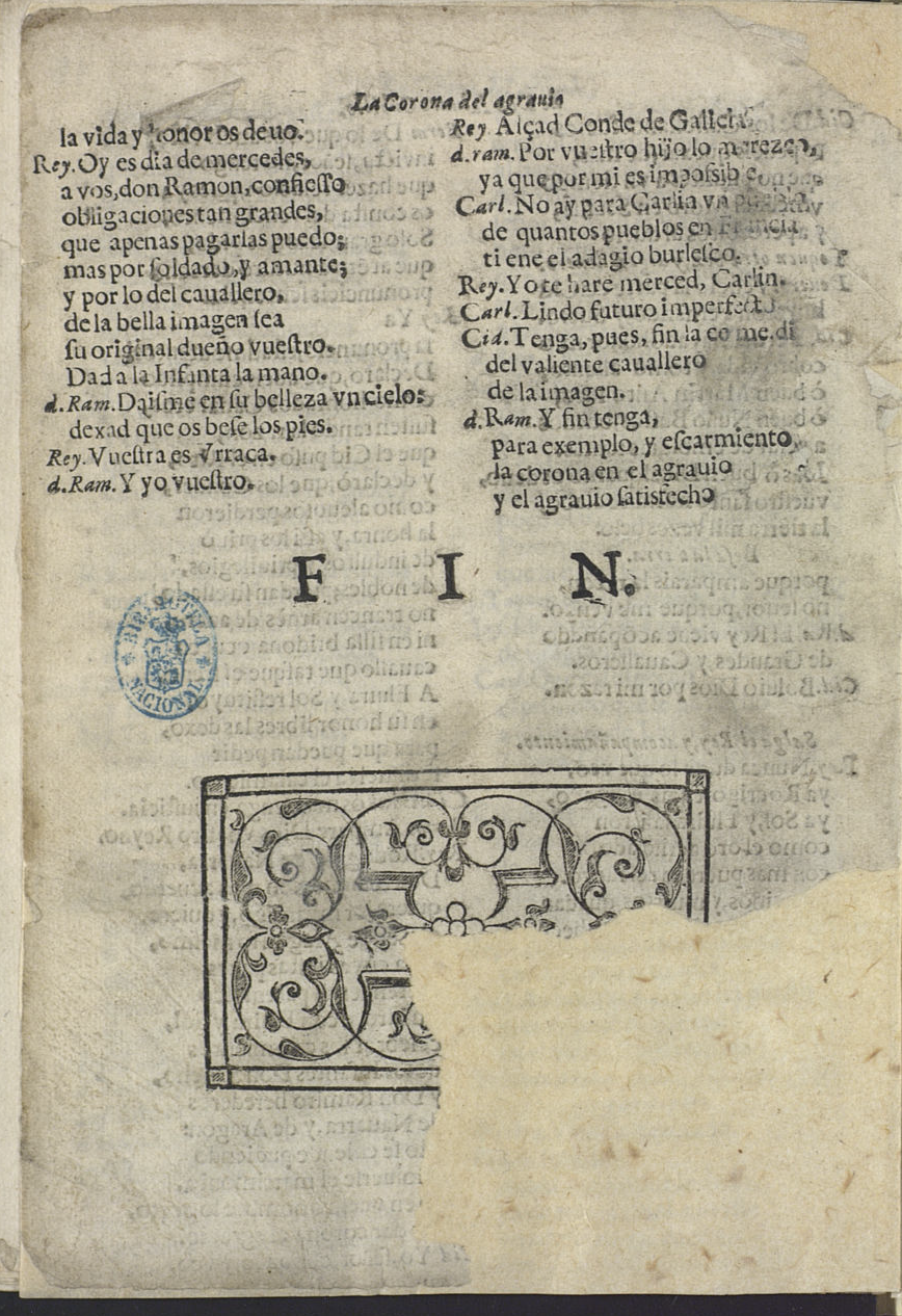 [final:] d. Ram. Y fin tenga, / para exemplo, y eʃcarmiento / la corona en el agrauio / y el agrauio ʃatisfecho / FIN.4º, A-D4, 32 pp. sin num. Tit: LA CORONA DEL AGRAVIO.