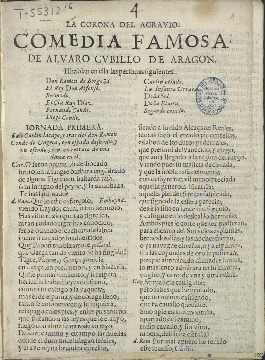 LA CORONA DEL AGRAVIO. / COMEDIA FAMOSA / DE ALVARO CVBILLO DE ARAGON. / Hhblan en ella las perʃonas ʃiguientes. / [ dram. Per. a 2 col.] /Sale Carlin lacayo, y tras del don Ramon / Conde de Ungria, con eʃpada deʃnuda, y /un eʃcudo, con un retrato de una / dama en èl.