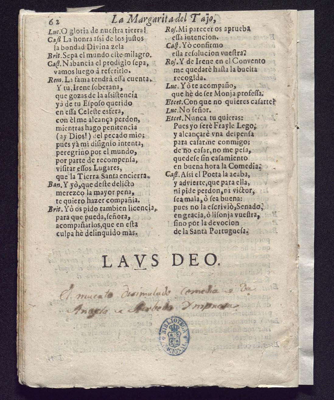 4º A-G⁴ H³ [1]- 62 pp. Tit: par: La Margarita del Tajo, [guillotinados en pp. 12, 20, 22, 24, 28, 30, 34, 36, 38, 40, 42] // Tit impar: Que diò nombre à Santarèn. [guillotinados en pp. 19, 21, 23, 27, 29, 31, 33, 35, 37, 39, 41]