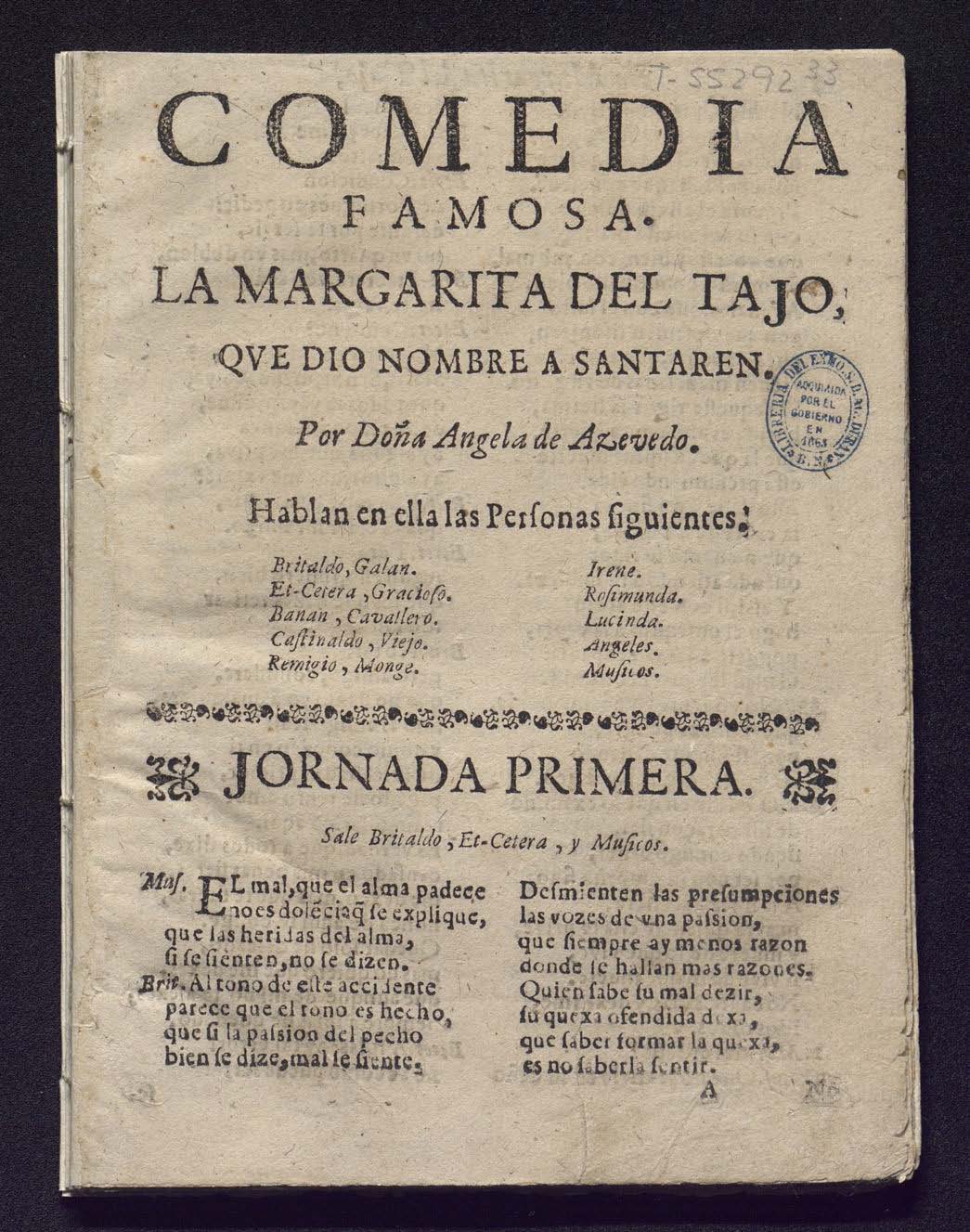COMEDIA / FAMOSA. / LA MARGARITA DEL TAJO, / QVE DIO NOMBRE A SANTAREN. / Por Doña Angela de Azevedo. / Hablan en ella las Perſonas ſiguientes. / [dram. pers. a 2 col.] / filete / [ornamento] JORNADA PRIMERA. [ornamento] / Sale Britaldo, Et-Cetera, y Muſicos. /Muſ. EL mal, que el alma padece / no es dolēcia q ſe explique,