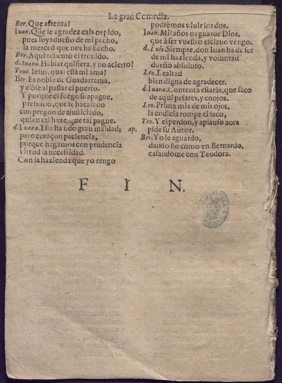 [final:] dando fin como vn Bernardo, / caſandome con Teodora. / FIN.