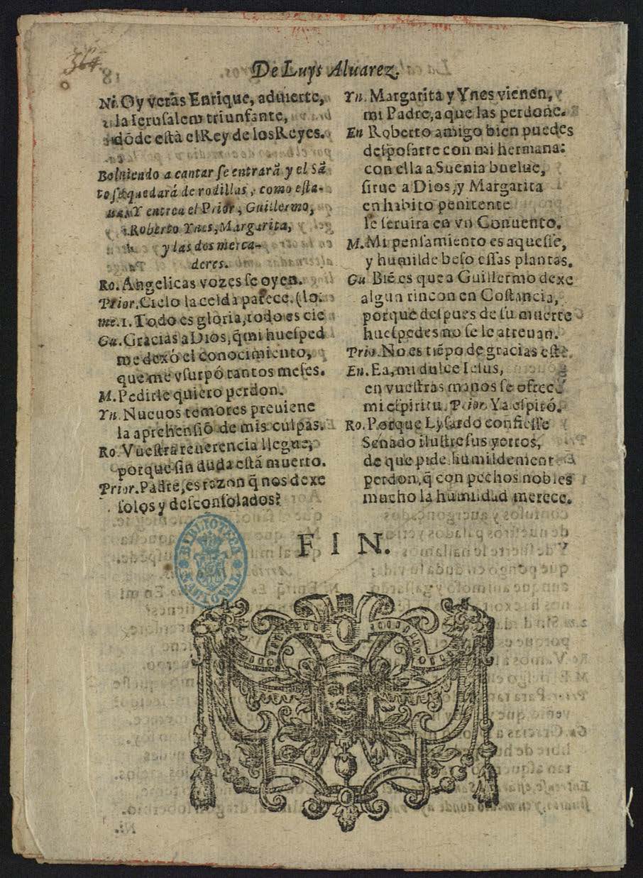 LA CALUMNIA EN LOS MILAGROS, / COMEDIA / FAMOSA. / DE LVYS ALVAREZ. / Representóla Franciʃco Lopez. / Hablan en ella las perʃonas ʃiguientes. / [Dram. Pers. A 3 cols.] / ACTO PRIMERO. / Entren Enrique de noche y Guillermo. / Gui Dixo otra vez qu`es aguero / tropeçar en la ocaʃion. / [final:] perdon, q con pechos nobles / mucho la humildad merece. / FIN.