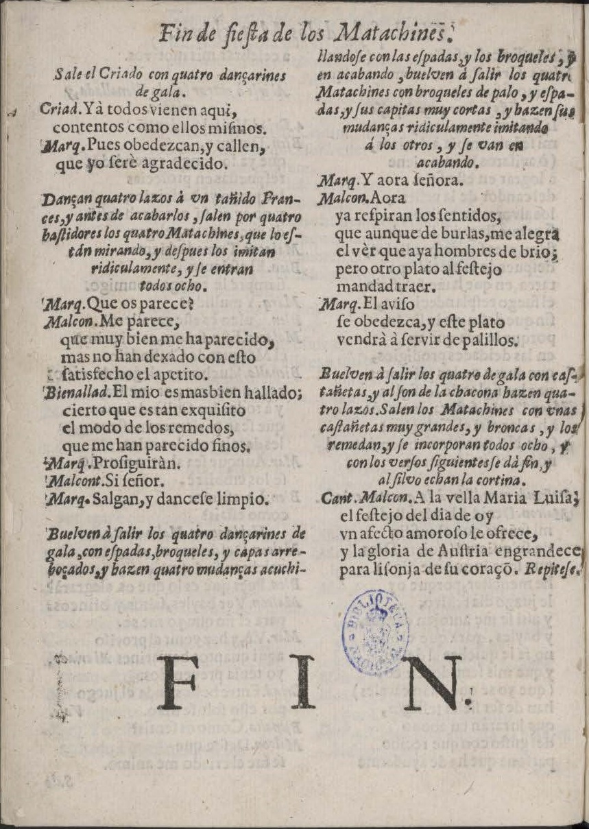 (H2v-H4v) FIN DE FIESTA DE LOS REMEDOS DE LOS / Matachines, de Simon Aguado. / Hablan en èl las perʃonas ʃiguientes. / [Dram. Pers. a 2 col.] / Sale la Malcontenta, y tres criadas con ella. / Malcont. Vellacas, deʃcaradas,atrevidas, / indignas de ʃervir, y ʃer ʃufridas;