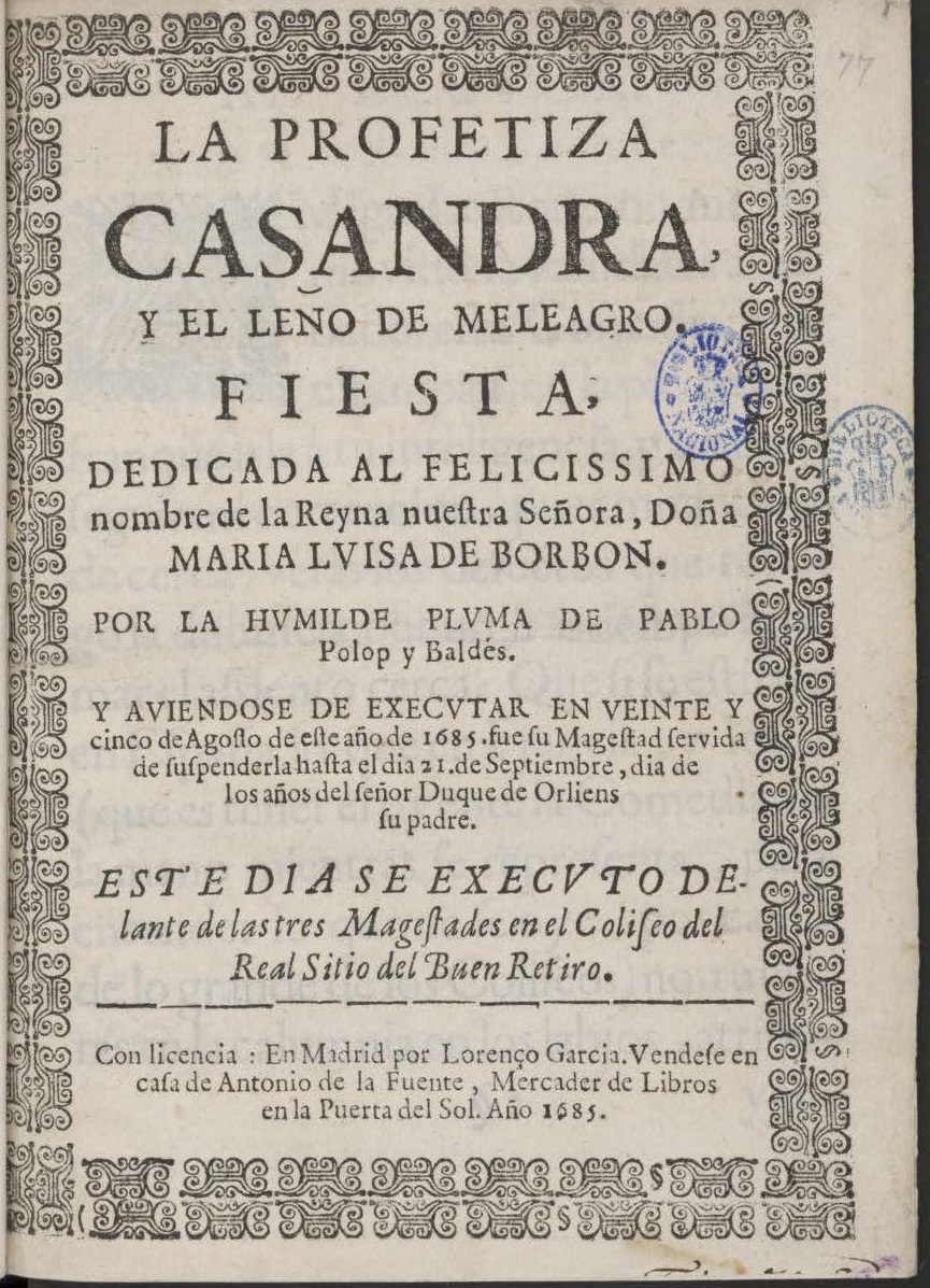 [portada:] LA PROFETIZA / CASANDRA, / Y EL LEÑO DE MELEAGRO. / FIESTA, / DEDICADA AL FELICISSIMO / nombre de la Reyna nueʃtra Señora, Doña / MARIA LVISA DE BORBON. / POR LA HVMILDE PLVMA DE PABLO / Polop y Baldés. / Y AVIENDOSE DE EXECVTAR EN VEINTE Y / cinco de Agoʃto de eʃte año de 1685. fue ʃu Mageʃtad ʃervida de / ʃuspenderla haʃta el dia 21. de Septiembre, dia de / los años del ʃeñor Duque de Orliens / ʃu padre. / ESTE DIA SE EXECUTO DE / lante de las tres Mageʃtades en el Coliʃeo del / Real Sitio del Buen Retiro. / filete horizontal / Con licencia: En Madrid por Lorenço Garcia. Vendese en / caʃa de Antonio de la Fuente, Mercader de Libros / en la Puerta del Sol. Año 1685. (¶1r)