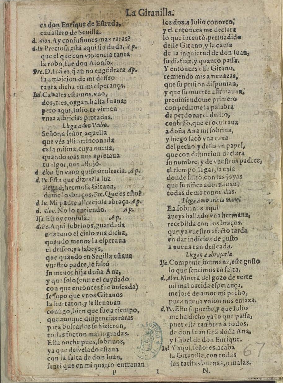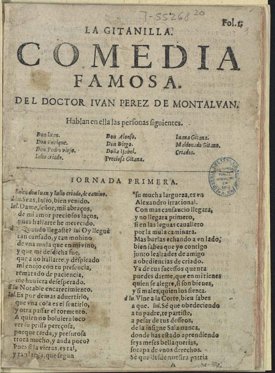 Fol. I. / LA GITANILLA. / COMEDIA / FAMOSA. / DEL DOCTOR IVAN PEREZ DE MONTALVAN. / Hablan en ella las perʃonas ʃiguientes. / [Dram. Pers. a 3 col.] / IORNADA PRIMERA / Salen don Iuan y Iulio criado, de camino. / D Iu. Seas Iulio bien venido. / Iul. Dame, ʃeñor, mil abraços,
