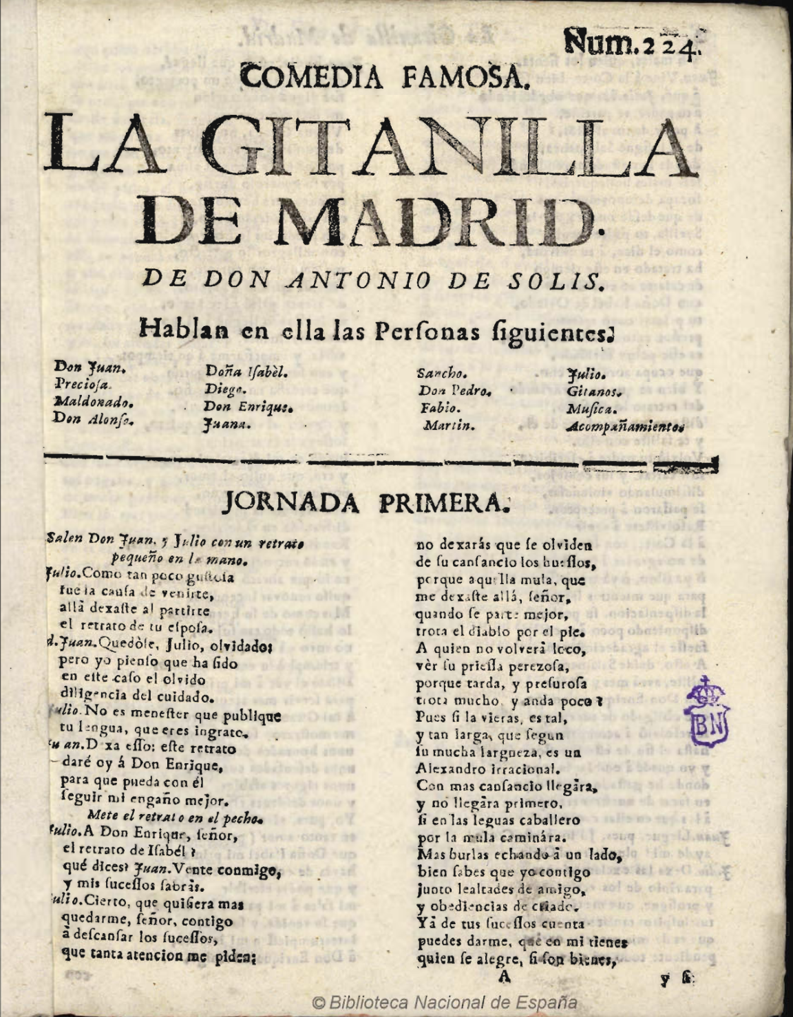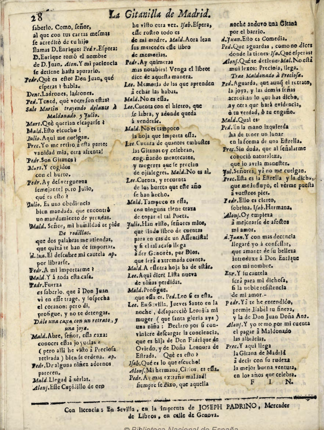 Num. 224. / COMEDIA FAMOSA. / LA GITANILLA DE MADRID. / DE DON ANTONIO DE SOLIS. / Hablan en ella las perʃonas ʃiguientes. / [dram. pers. a 4 col.] / JORNADA PRIMERA. / Salen Don Juan. y Julio con un retrato / pequeño en la mano. / Julio. Como tan poco guʃtoʃa / fue la cauʃa de venirte, / allá dexaʃte al partirte / el retrato de su eʃposa. / [final:] Prec. Y aquí llega / la Gitana de Madrid / à decir con ʃu rudeza / la mejor buena ventura, / en los años que celebra. / FIN. / Con licencia : En Sevilla , en la Imprenta de JOSEPH PADRINO , Mercader / de Libros , en calle de Genova.