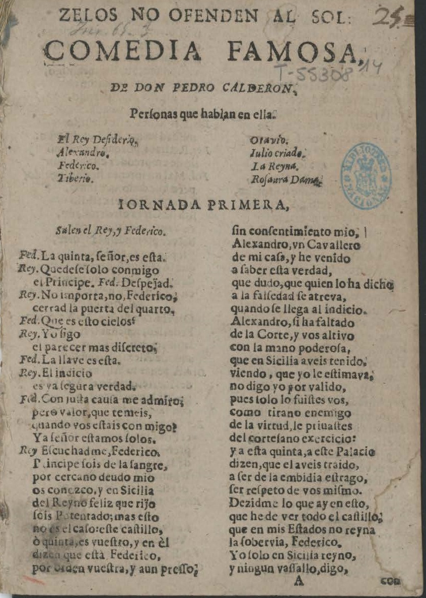 ZELOS NO OFENDEN AL SOL: / COMEDIA FAMOSA, / DE DON PEDRO CALDERON, / Perſonas que hablan en ella. / [dram. pers. a 2 col.] / IORNADA PRIMERA, / Salen el Rey,y Federico. / Fed. La quinta, ſeñor,es eſta. / Rey. Quedeſeſolo conmigo