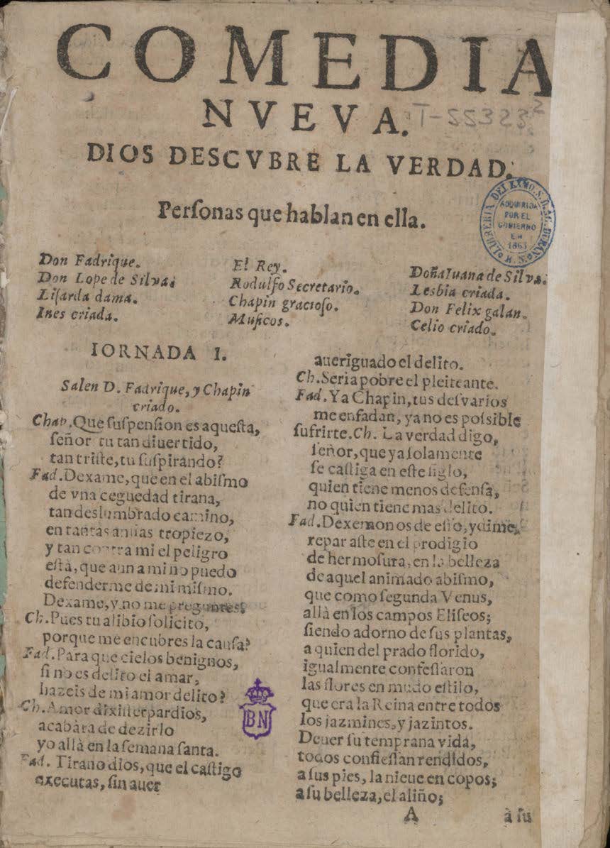 COMEDIA / NVEVA. / DIOS DESCVBRE LA VERDAD. / Perʃonas que hablan en ella. / [dram. pers. a 3 col.] / IORNADA I. / Salen D. Fadrique y Chapin / criado. / Chap. Que ʃuʃpenʃion es aqueʃta, / ʃeñor tu tan diuertido,