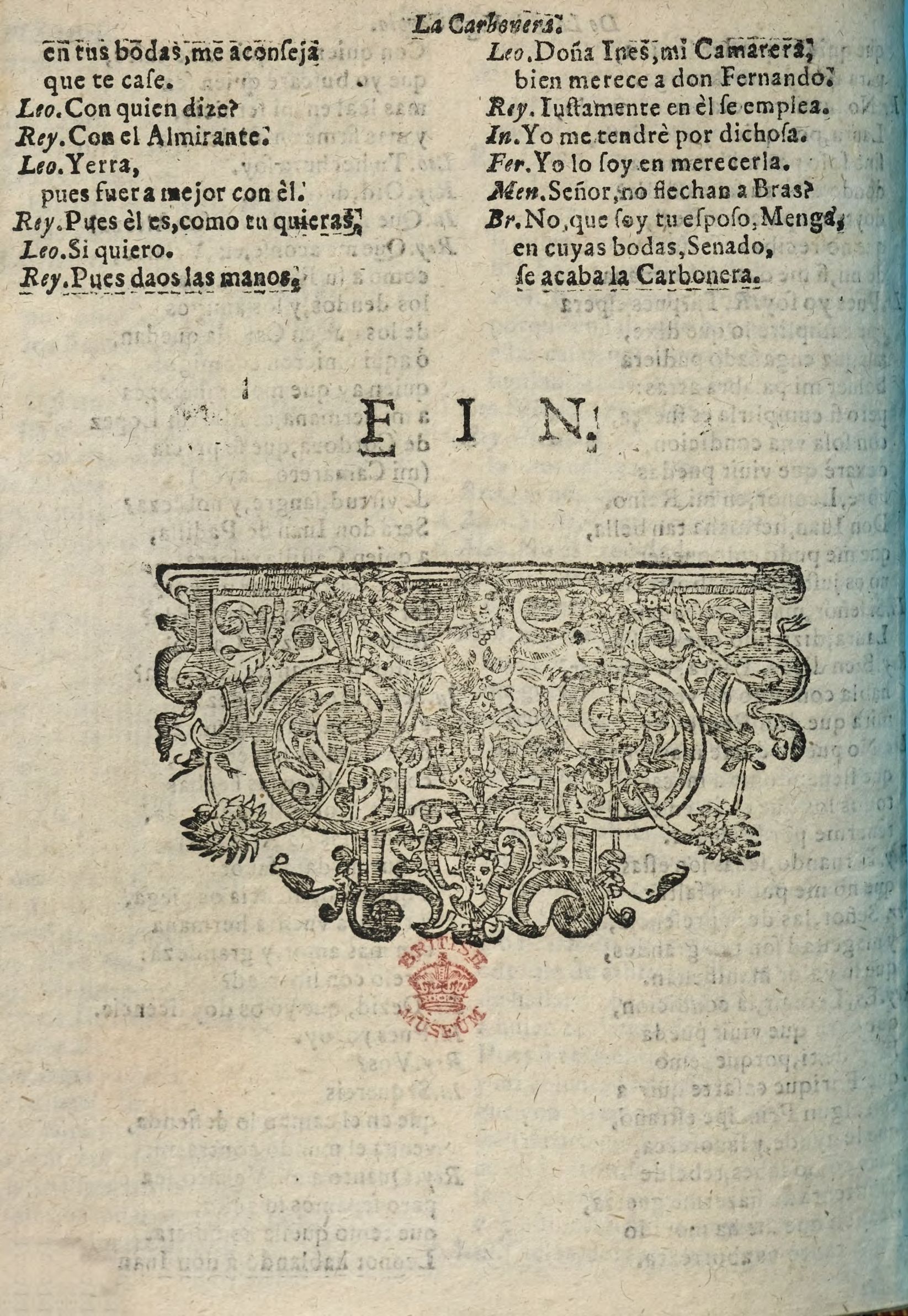 [final] de cuyas bodas, Senado, / ſe acaba la Carbonera. / F I N. / [taco xil.]