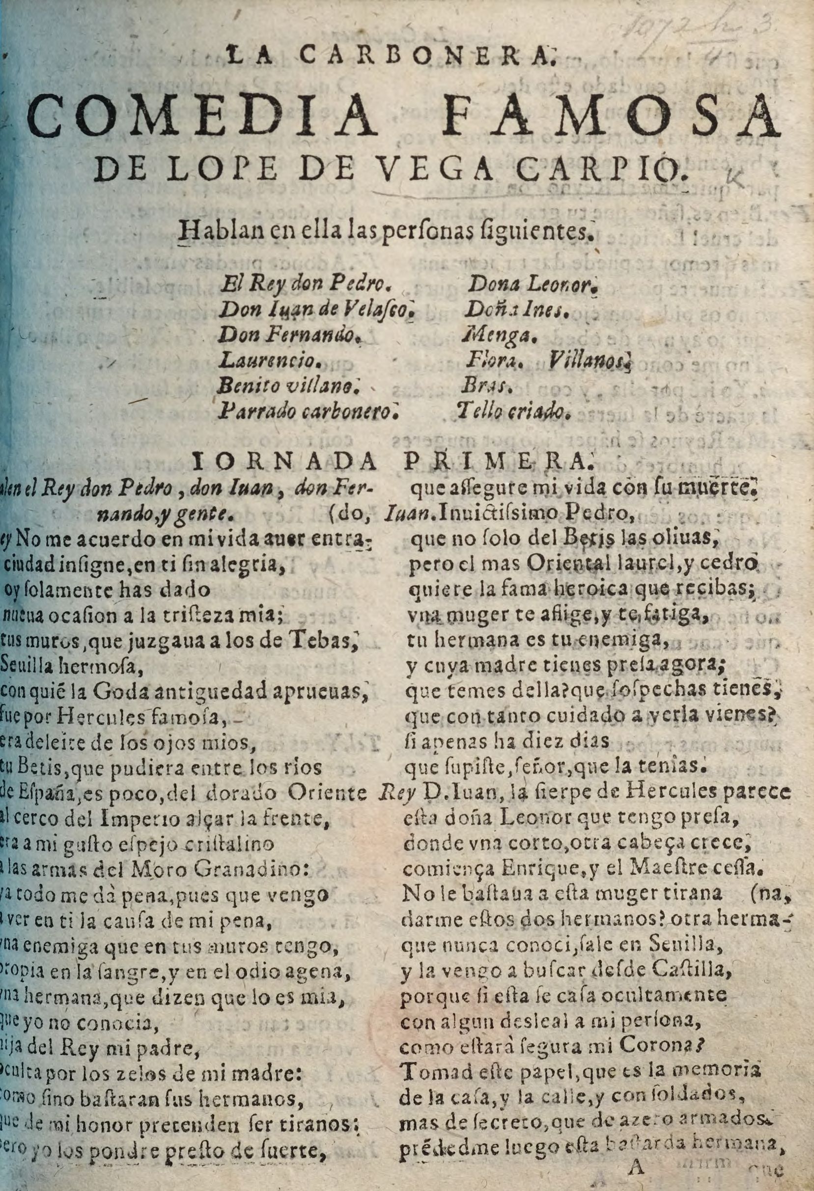 LA CARBONERA. / COMEDIA FAMOSA / DE LOPE DE VEGA CARPIO. / Hablan en ella las perſonas ſiguientes. / [dram. pers. a 2 col.] / IORNADA PRIMERA. / Salen el Rey don Pedro, don Iuan, don Fer- / nando, y gente. / Rey No me acuerdo en mi vida auer entra- / [do, | ciudad inſigne, en ti ſin alegría,